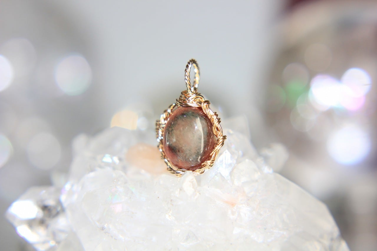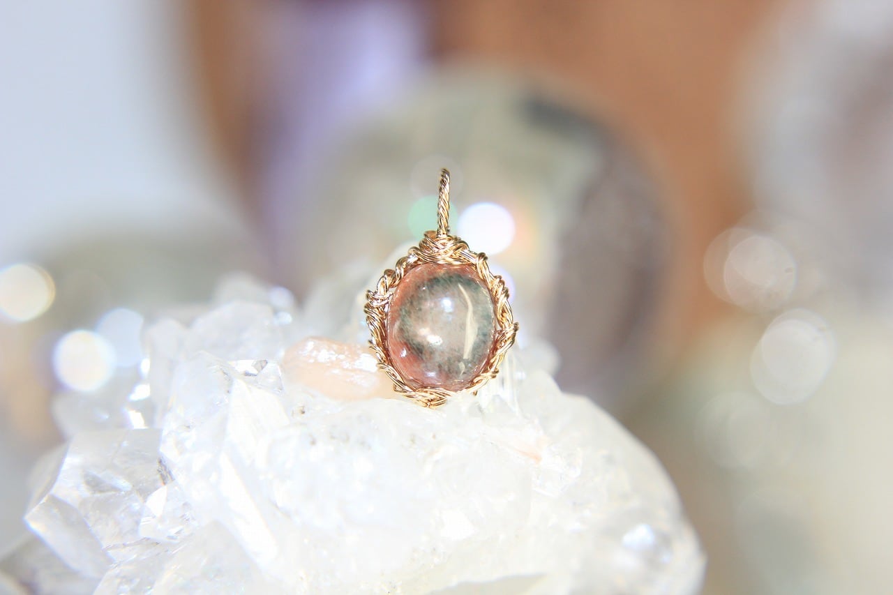 当店のワイヤーアートは天然石に合わせて、一つ一つハンドメイドで仕上げております。天然石をワイヤーでなるべく隠さないように工夫して、頑丈に仕上げました。手作業によるワイヤーアートには、不思議な優しさと美しさがあり、繊細に編み込まれたゴールドのワイヤーアートが、石を優しく包みこみます。天然石もワイヤーアートも、同じものはふたつとない一点ものです。