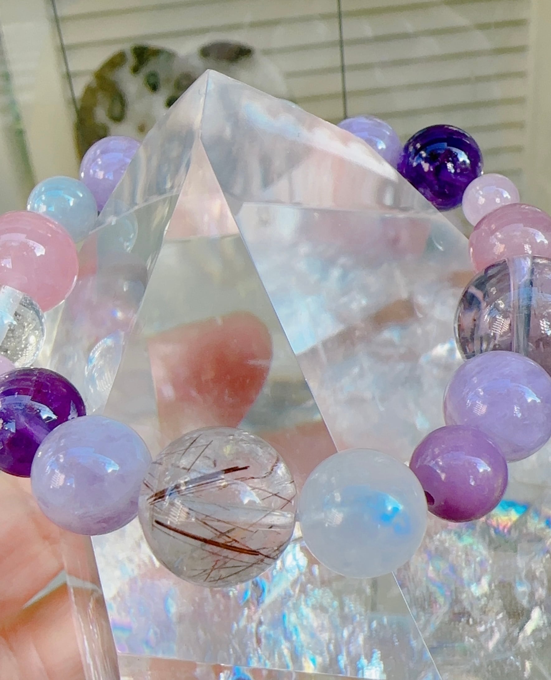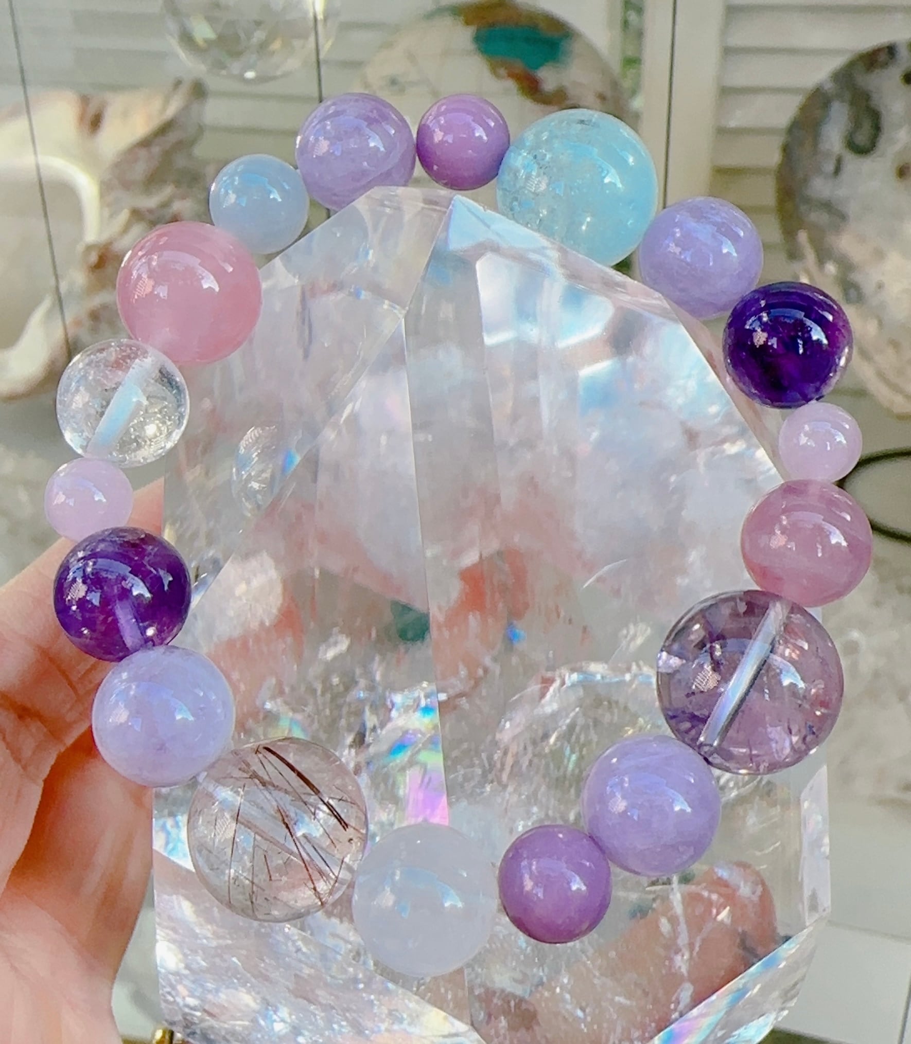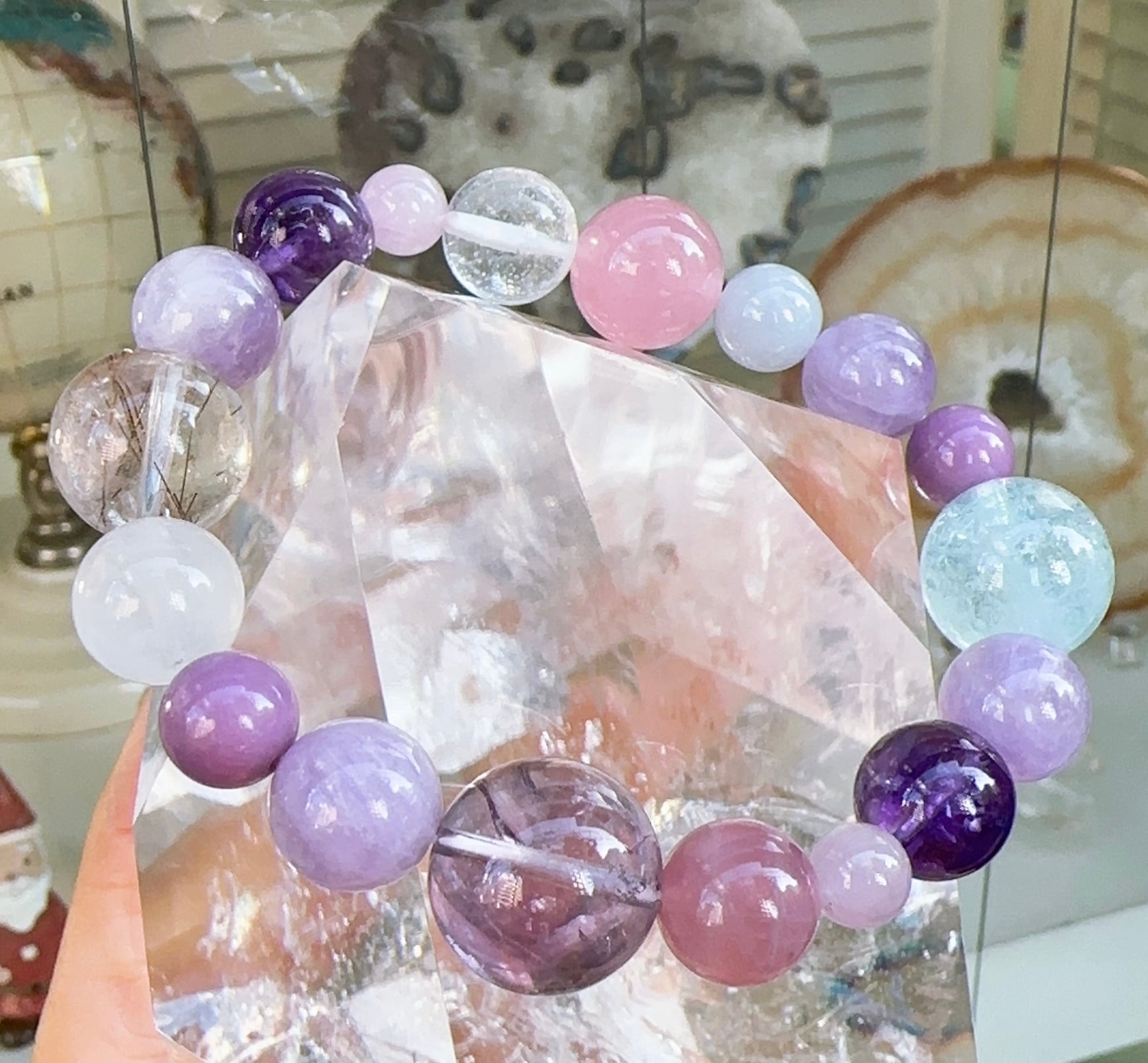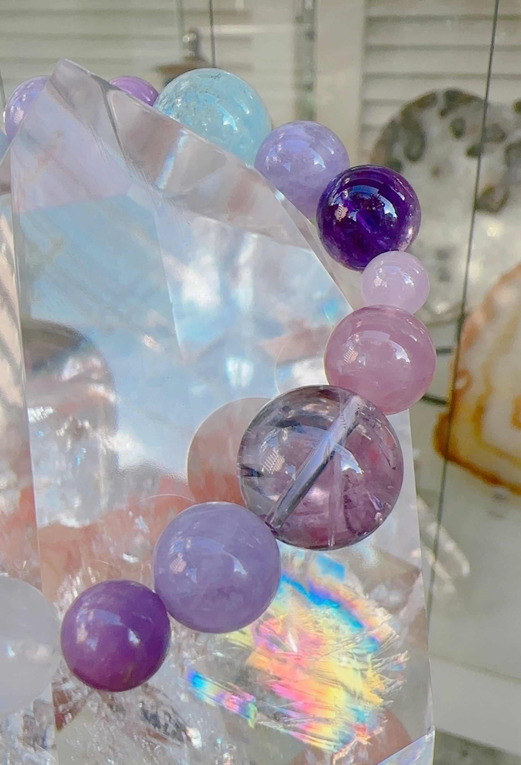マダガスカル産ディープローズクォーツ 約12mm(1個),レッドブラウンルチルクォーツ約12mm(1個),クリアアメジストクォーツ約14mm(1個),アクアマリン約14mm(1個),フォスフォシデライト約8mm(2個),アメジスト約10mm(2個),ラベンダーアメジスト約10mm(4個),ブルームーンストーン約10mm(1個),サチャロカアゼツライトH&E社約10mm(1個),ラベンダーひすい約8mm(1個),クンツァイト約6mm(2個),マダガスカル産ディープローズクォーツ約10㎜(1個)