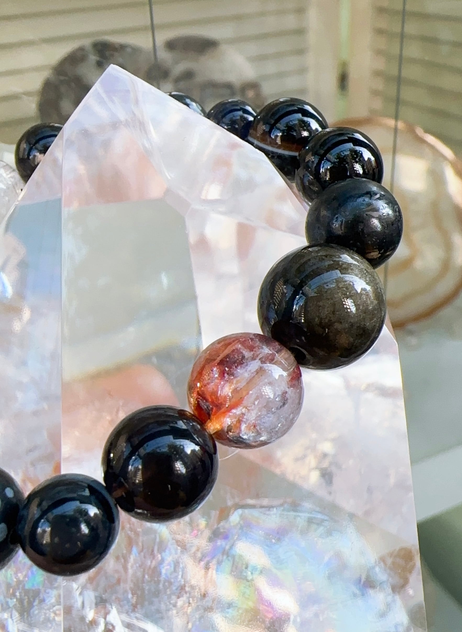 スギライト約11mm(1個),ブラックトルマリンinクォーツ約13mm(1個),ゴールデンオブシディアン約12mm(1個),リモナイトinクォーツ約10mm(1個),ヌーマイト約10mm(2個),スノーフレークオブシディアン約10mm(2個),モーリオン約10mm(4個),天眼石約10mm(2個),天眼石約8mm(2個),マイカアイオライト約8mm(2個)