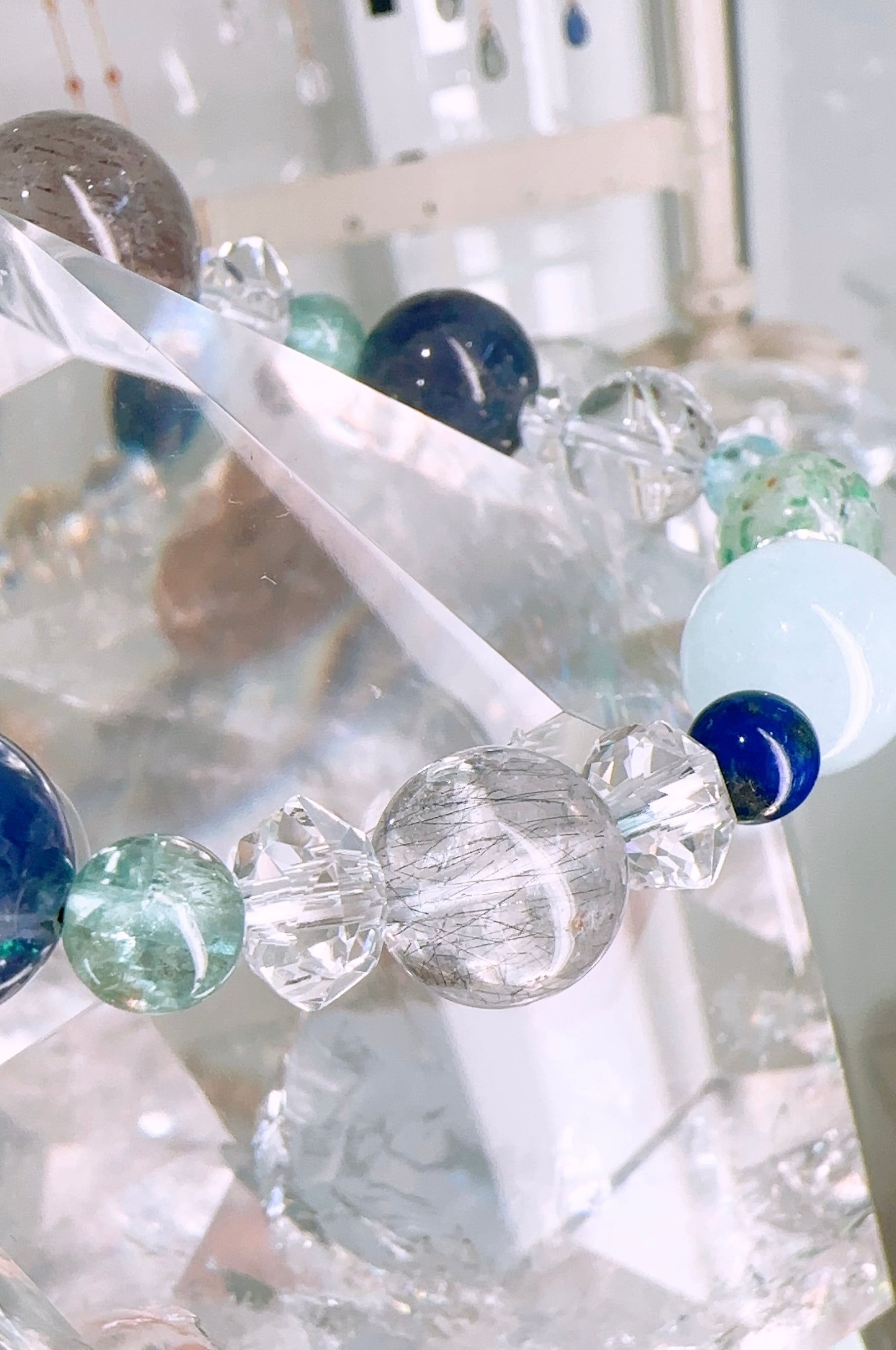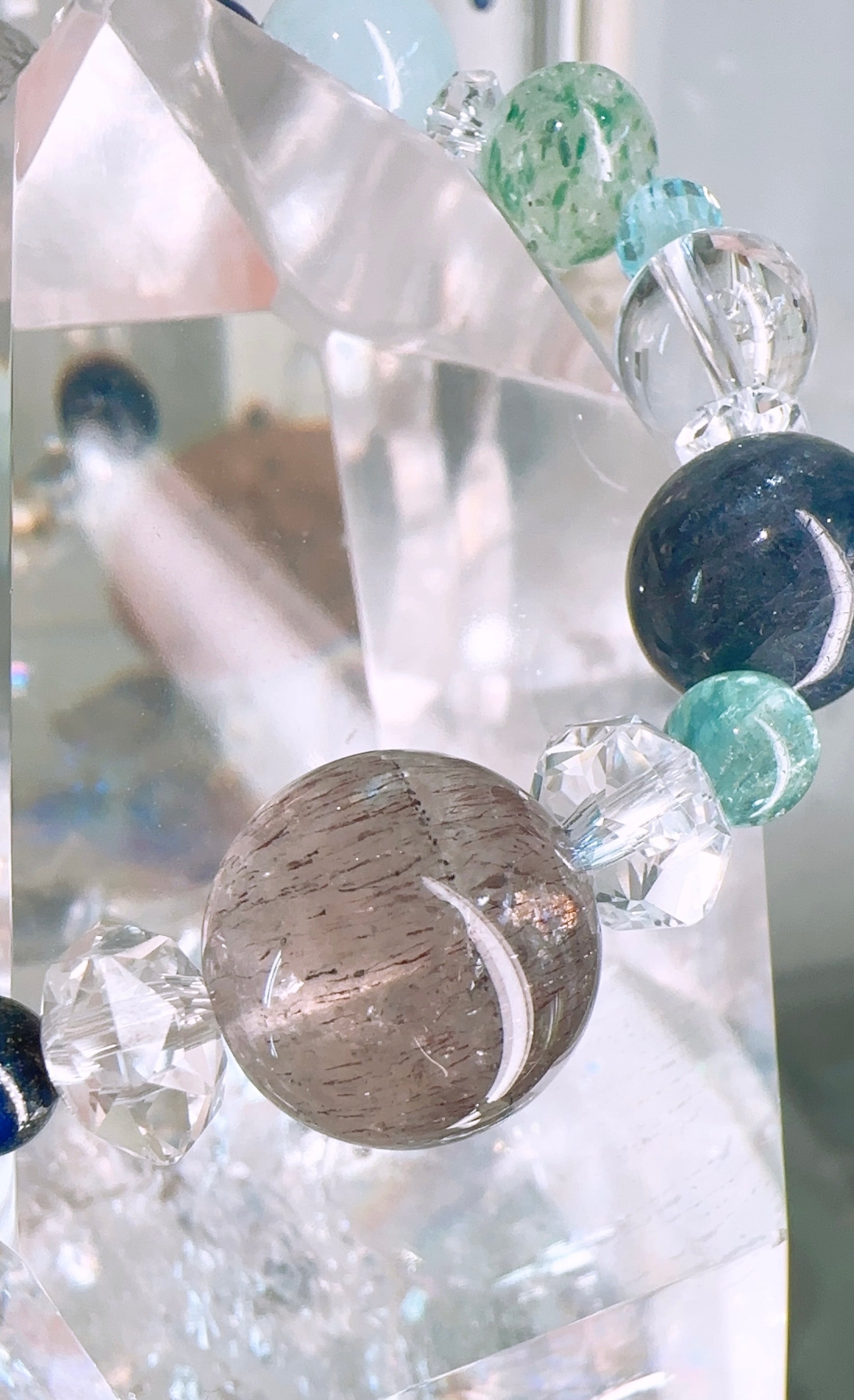 スーパーセブン約16mm(1個),タンザナイト約13mm(1個),アイオライト約12mm(1個),ライトスーパーセブン約11mm(1個),アクアマリン約12mm(2個),カイヤナイトinクォーツ約9mm(1個),カイヤナイトinクォーツ約11mm(1個),天然水晶約10mm(2個),アパタイト約7mm(2個),ラピスラズリ約6mm(2個),ブルートパーズ約5mm(2個),カット水晶約7mm(2個),カット水晶約6mm(2個),カット水晶約3mm(4個)