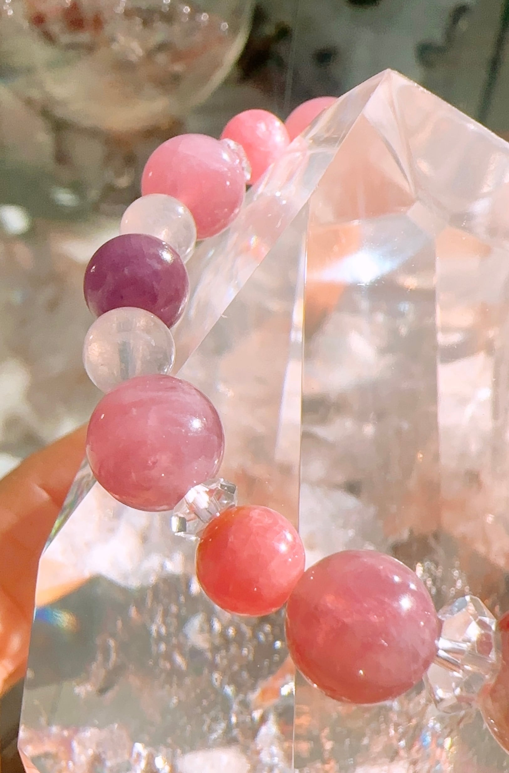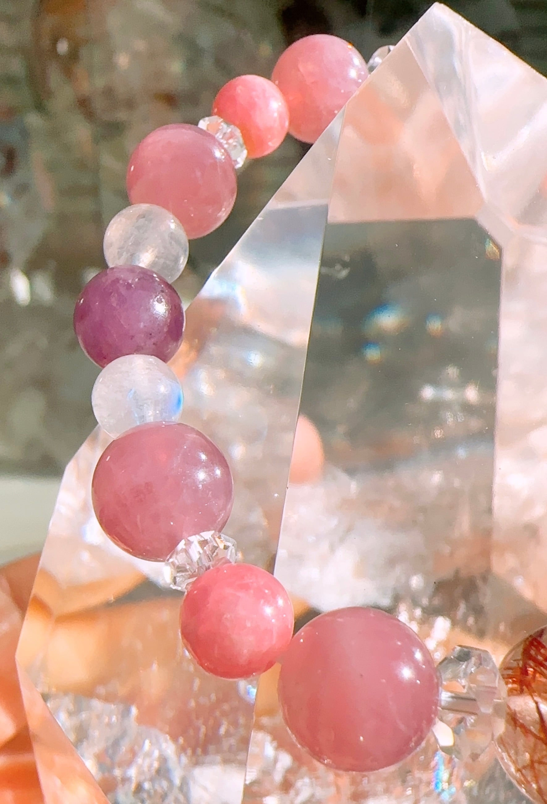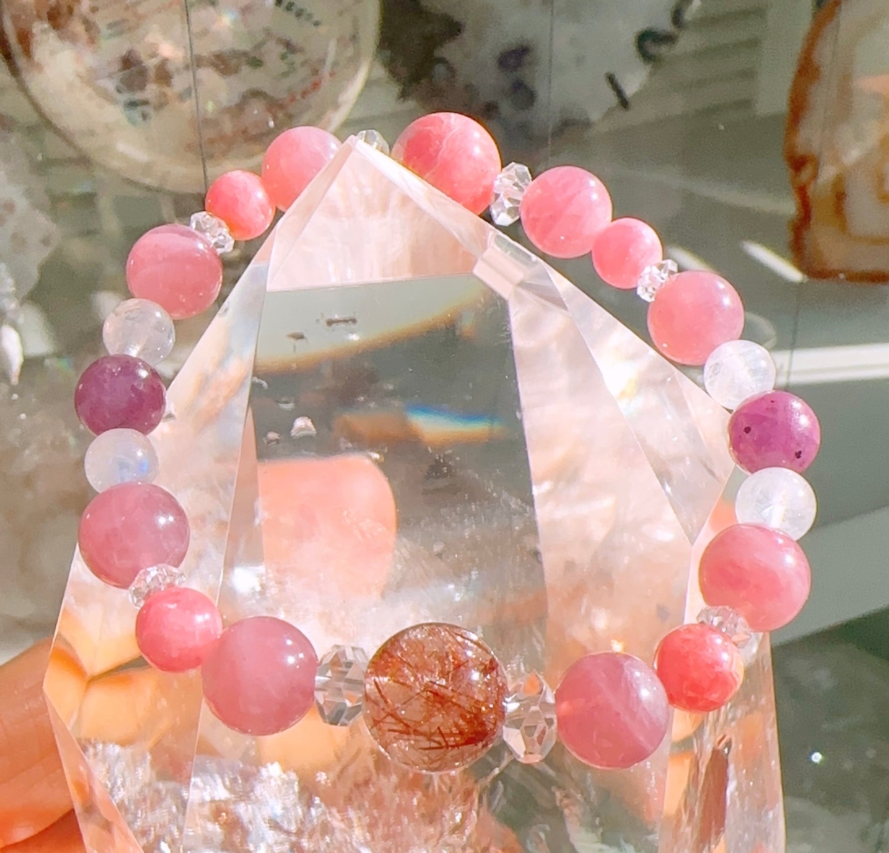 インカローズ約11mm(1個),レッドルチルクォーツ約10.5mm(1個),マダガスカルローズクォーツ約8.5mm(8個),ピンクサファイア約7.5mm(2個),レインボームーンストーン約6mm(4個),インカローズ約6mm(4個),カット水晶約3mm(4個),カット水晶約1.5mm(4個)