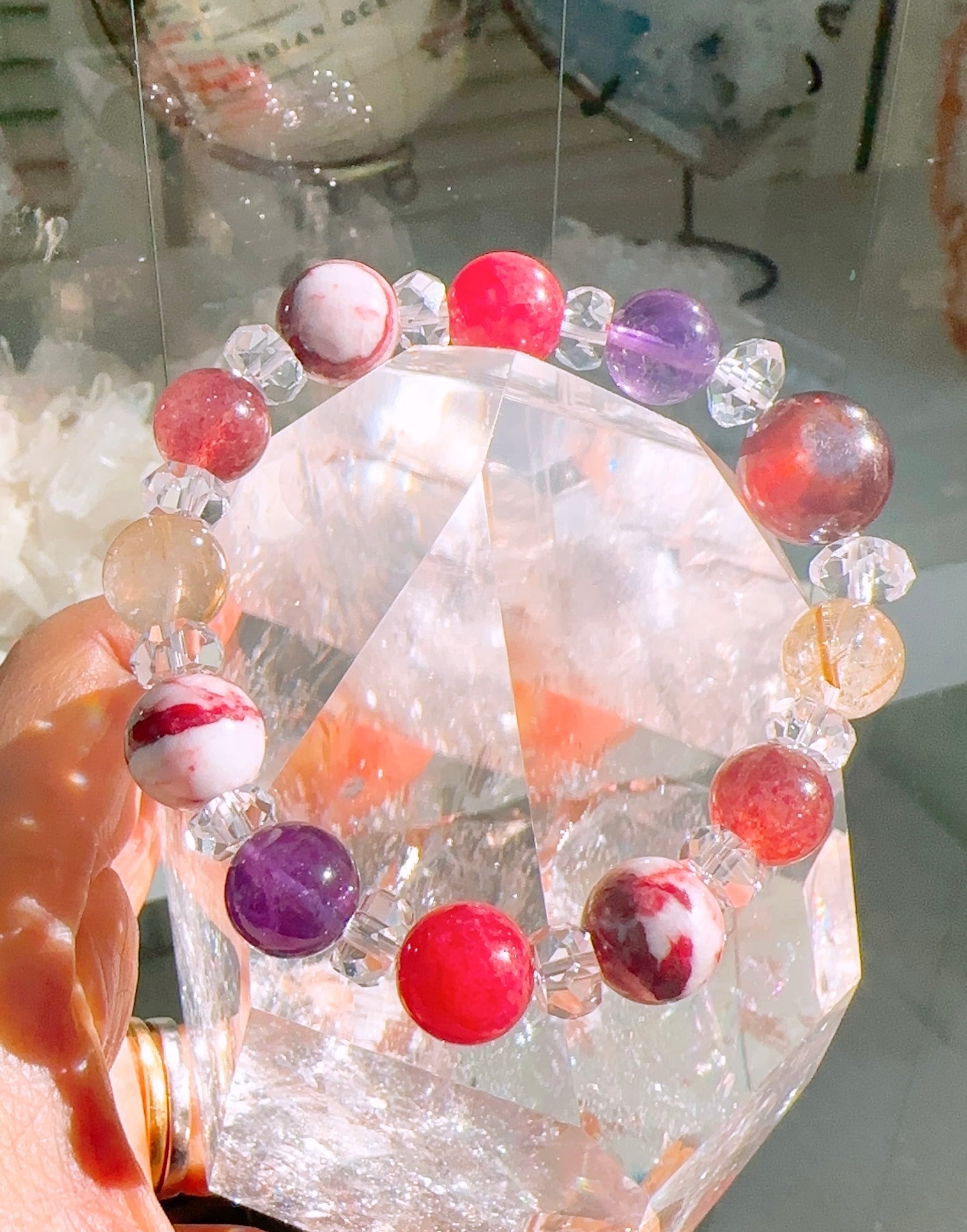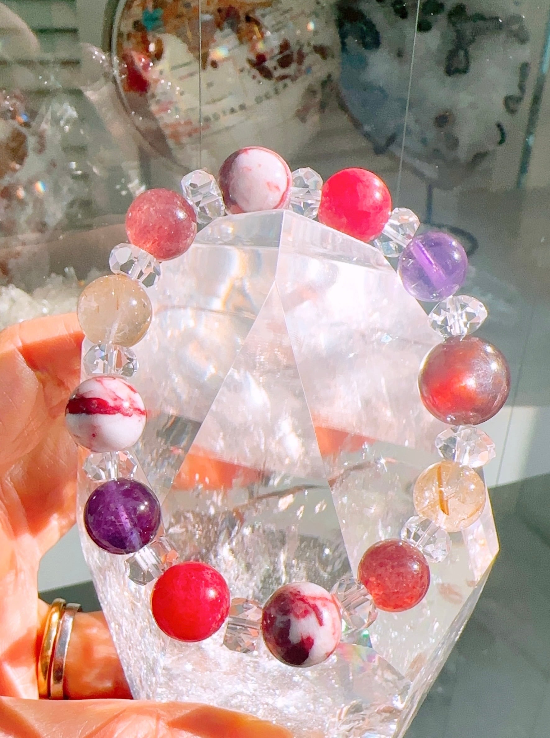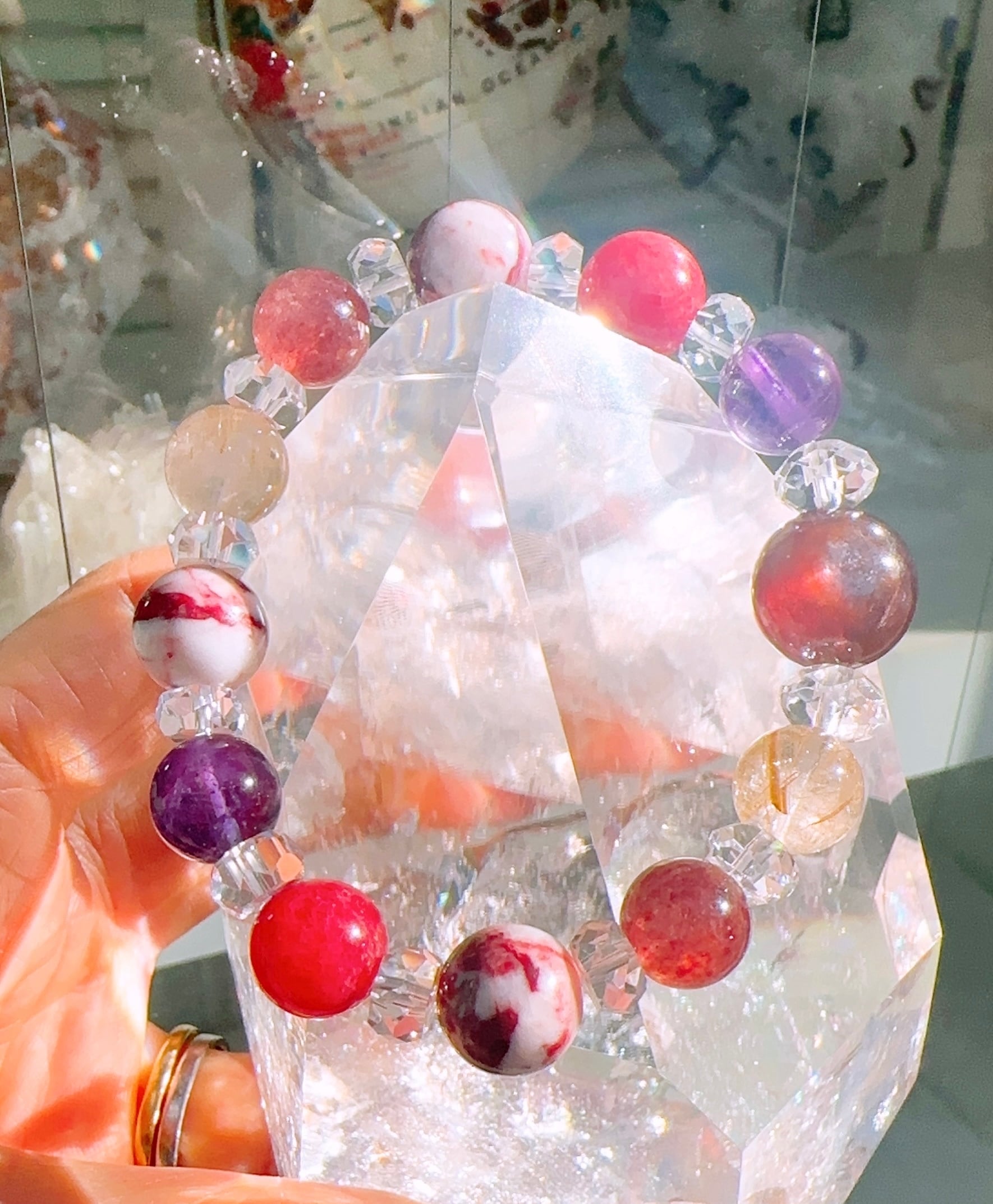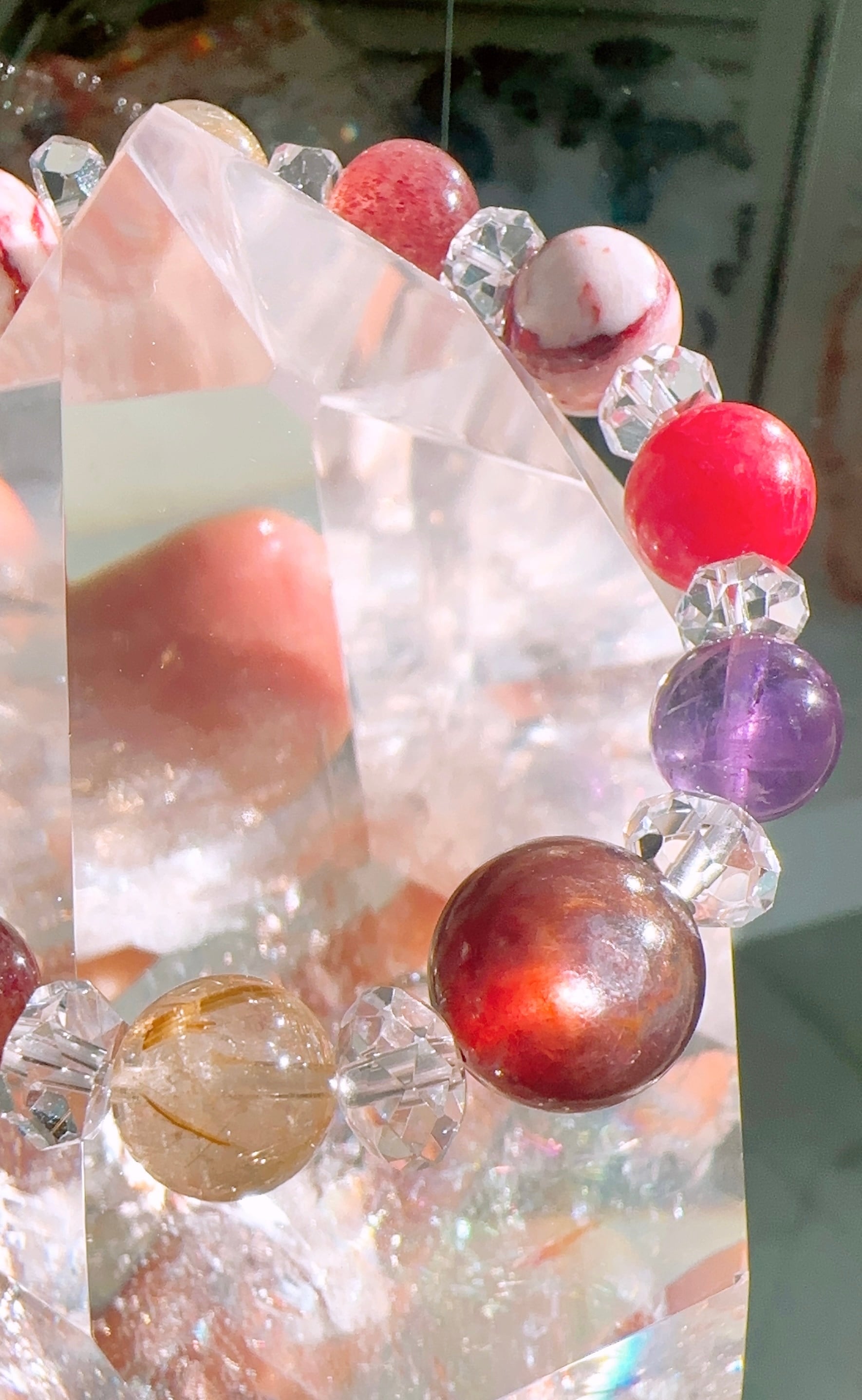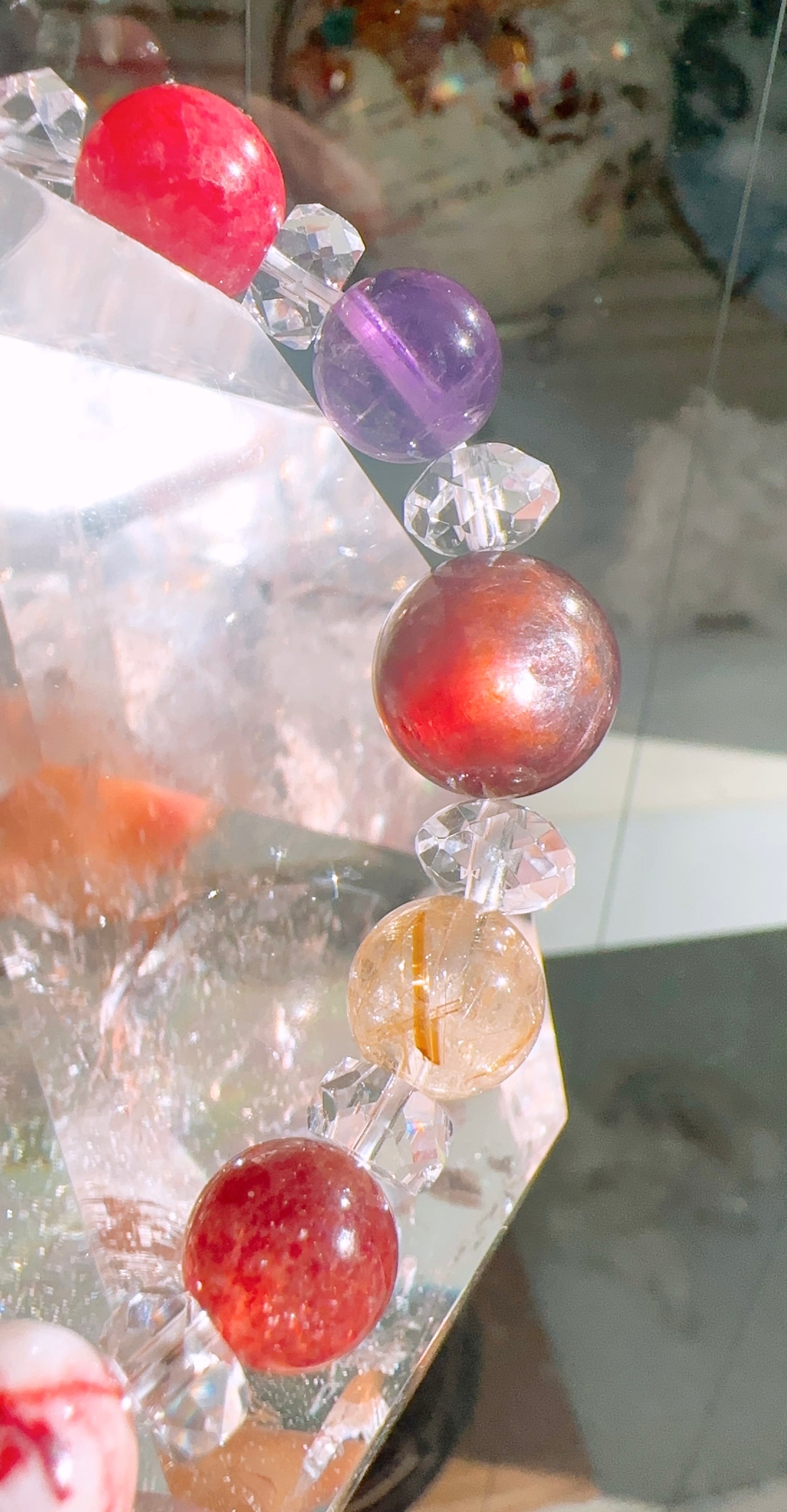 スターレピドライト約13mm(1個),ルチルクォーツ約10mm(2個),シンナバー約11mm(3個),ピンクエピドートインクォーツ約10mm(2個),アメジスト約10mm(2個),ロードナイトAAA約10mm(2個),スターカット水晶約5mm(2個),ボタンカット水晶約3.5mm(10個)