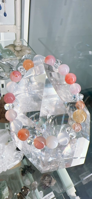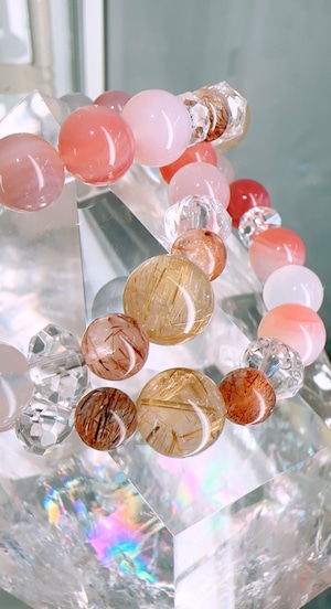 ピンクボツワナアゲート約8.5mm(15個),ルチルクォーツ約10mm(1個),フォリエーテッドクォーツ(マイカクォーツ)約6mm(2個),カット水晶約6mm(2個),ボタンカット水晶約4mm(4個)