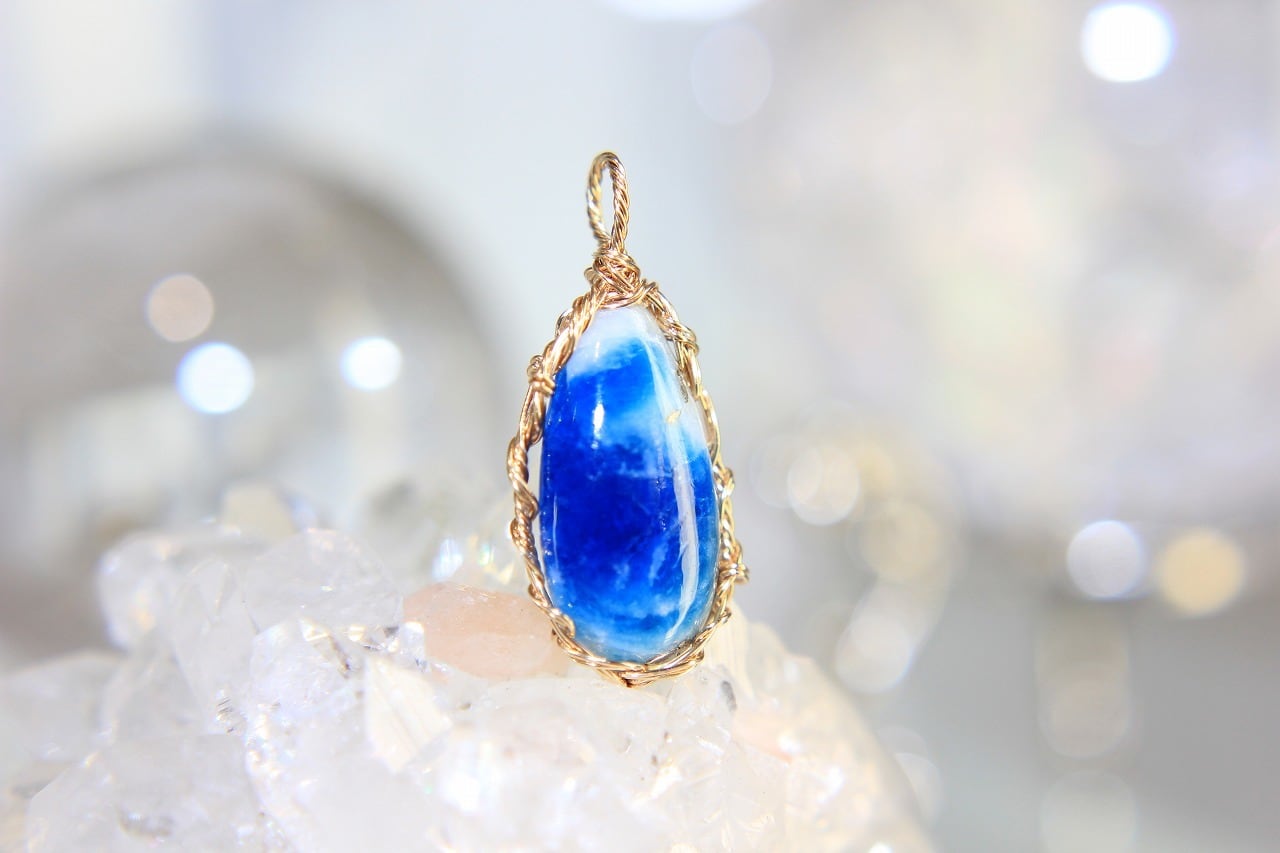 アフガナイトはラピスラズリの構成鉱物の一つであるソーダライトとともに産出されます。色は無色からブルーで、硫黄を多く含むほどに濃い青色に、逆に硫黄を含まない場合はカラーレスから白色になります。