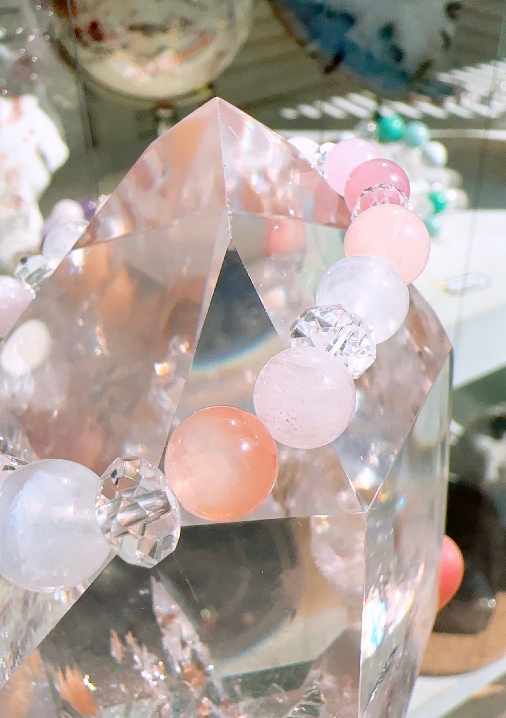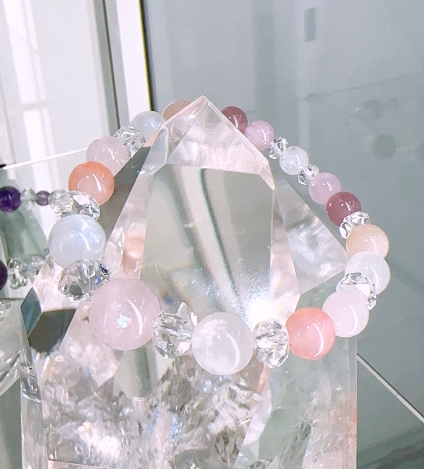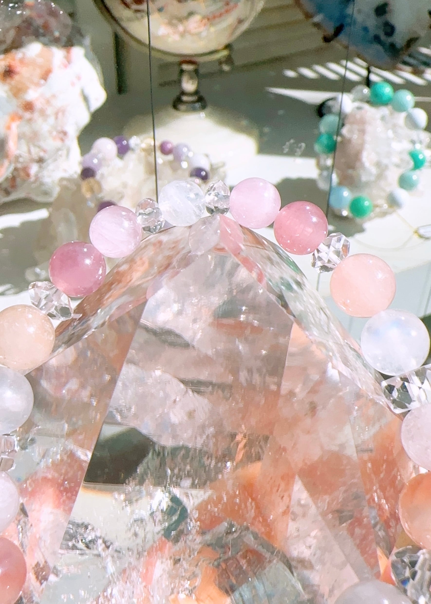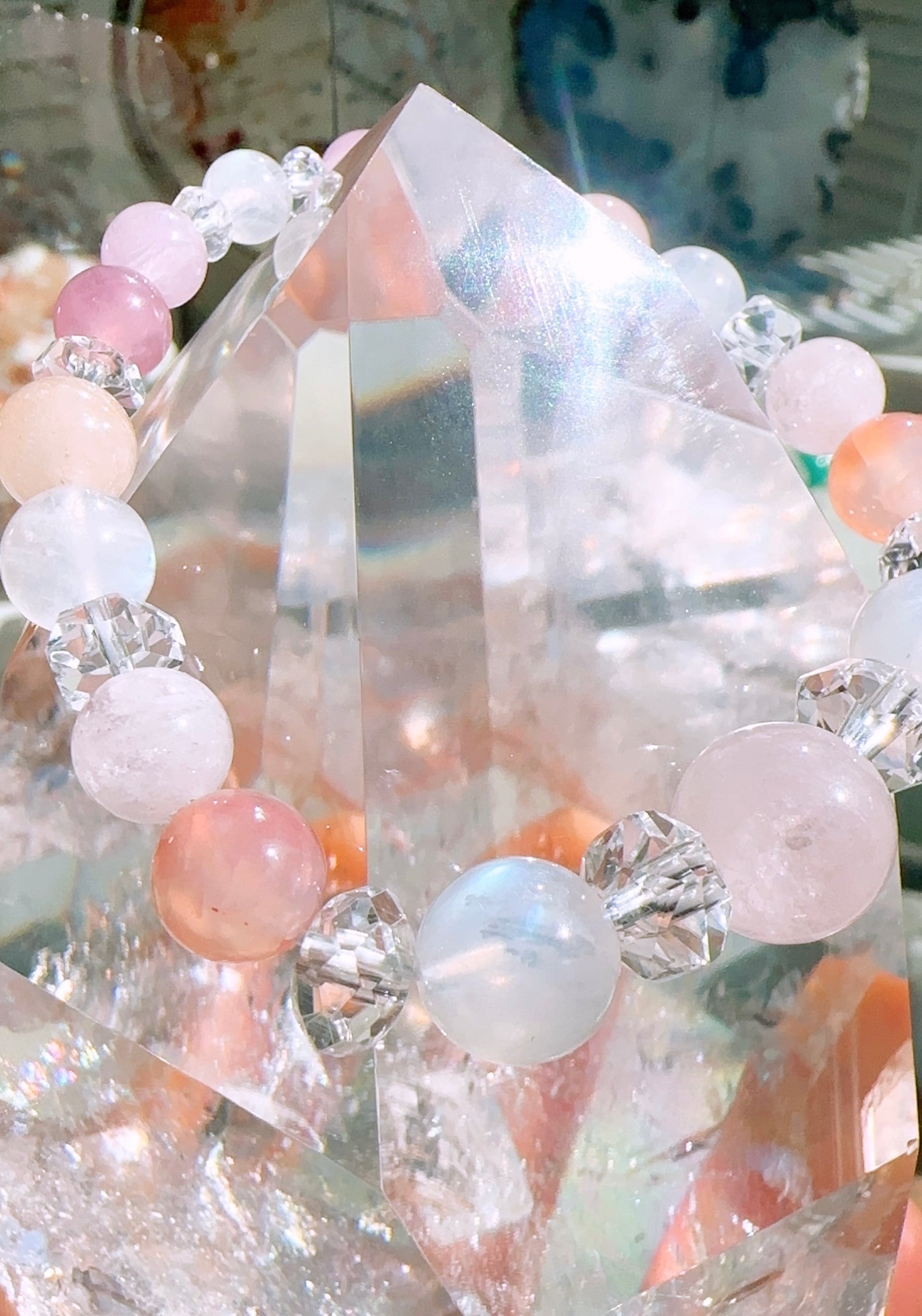 モルガナイト約12mm(1個),レインボームーンストーン約10mm(2個),ピンクボツワナアゲート約8.5mm(2個),モルガナイト約8mm(4個),レインボームーンストーン約8mm(2個),ディープローズクォーツ約7mm(2個),クンツァイト約6mm(2個),レインボームーンストーン約6mm(1個),スターカット水晶約7mm(2個),ボタンカット水晶約5mm(2個)ボタンカット水晶約4mm(2個),カット水晶約3.5㎜(2個),カット水晶約3mm(2個)