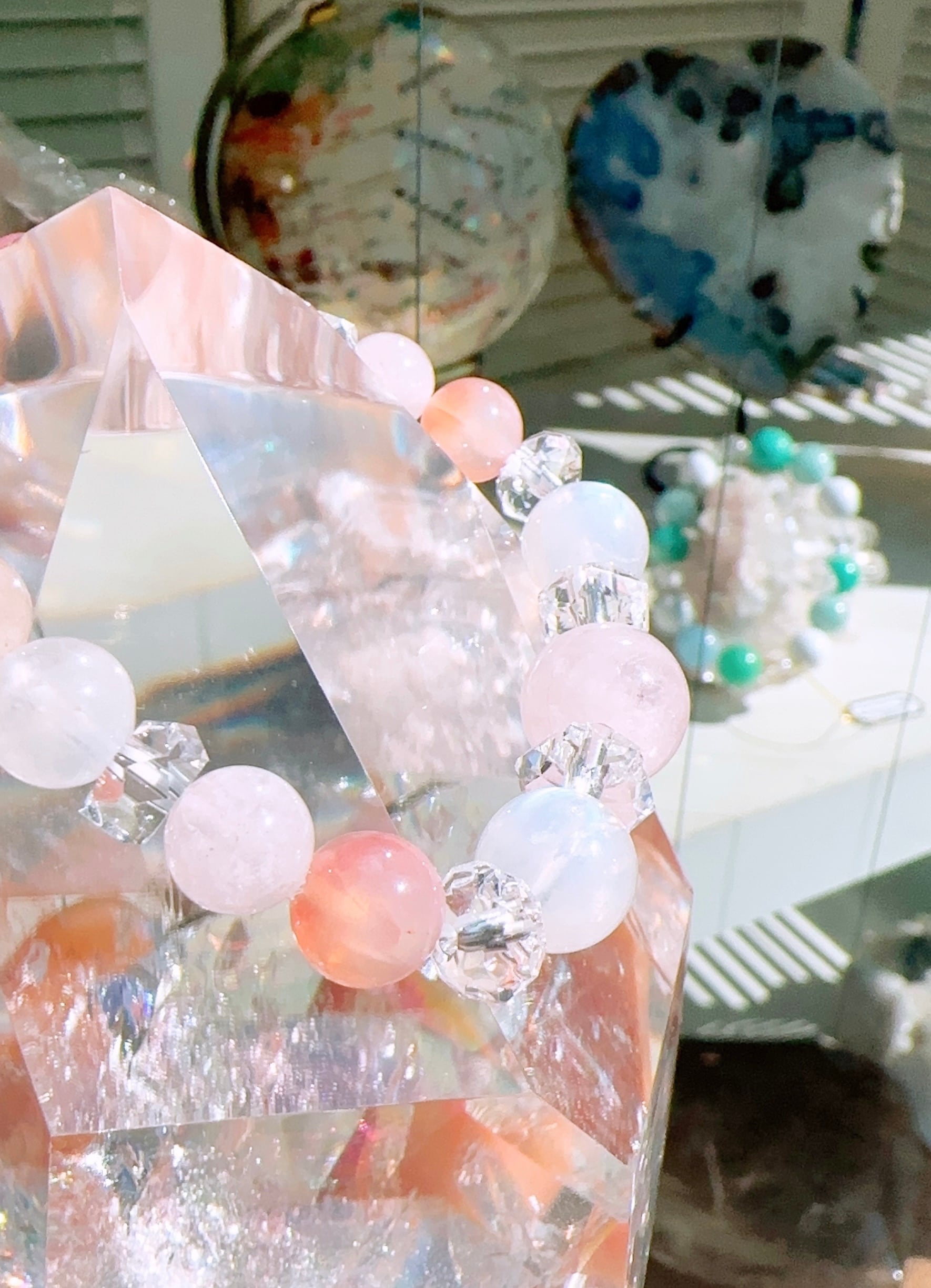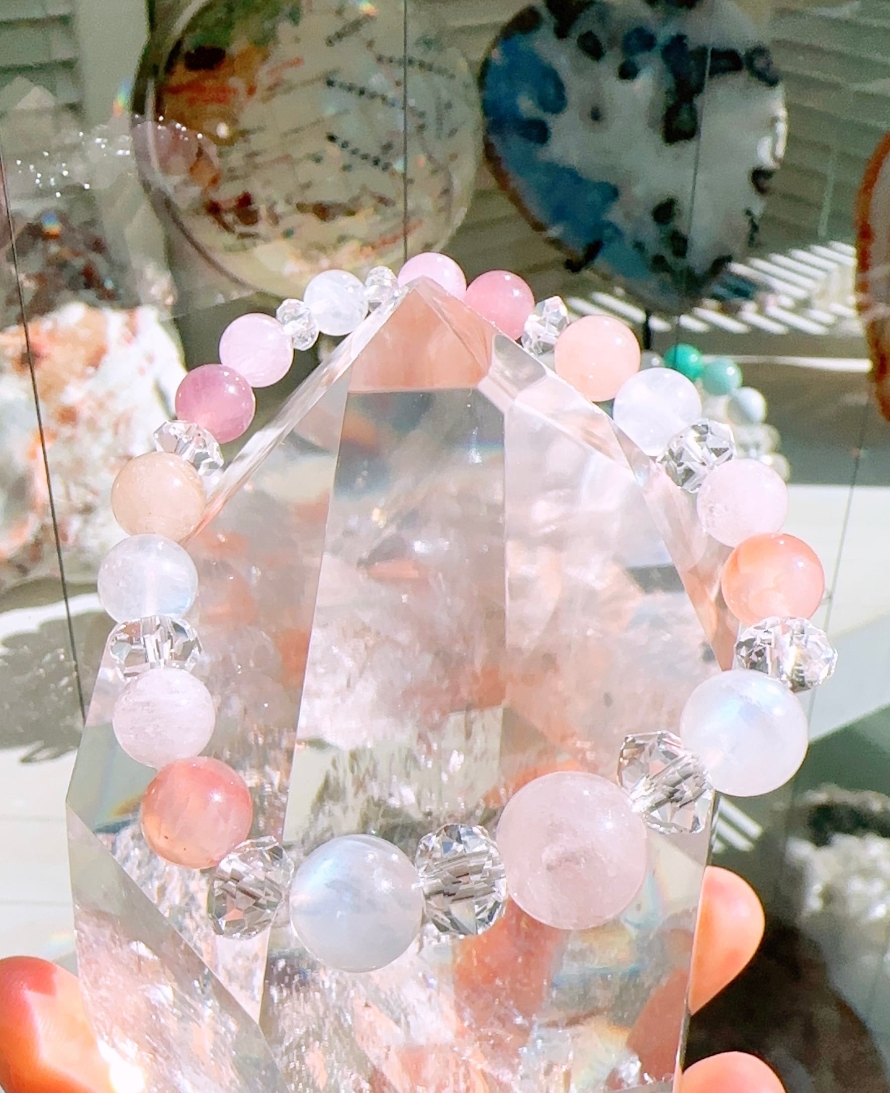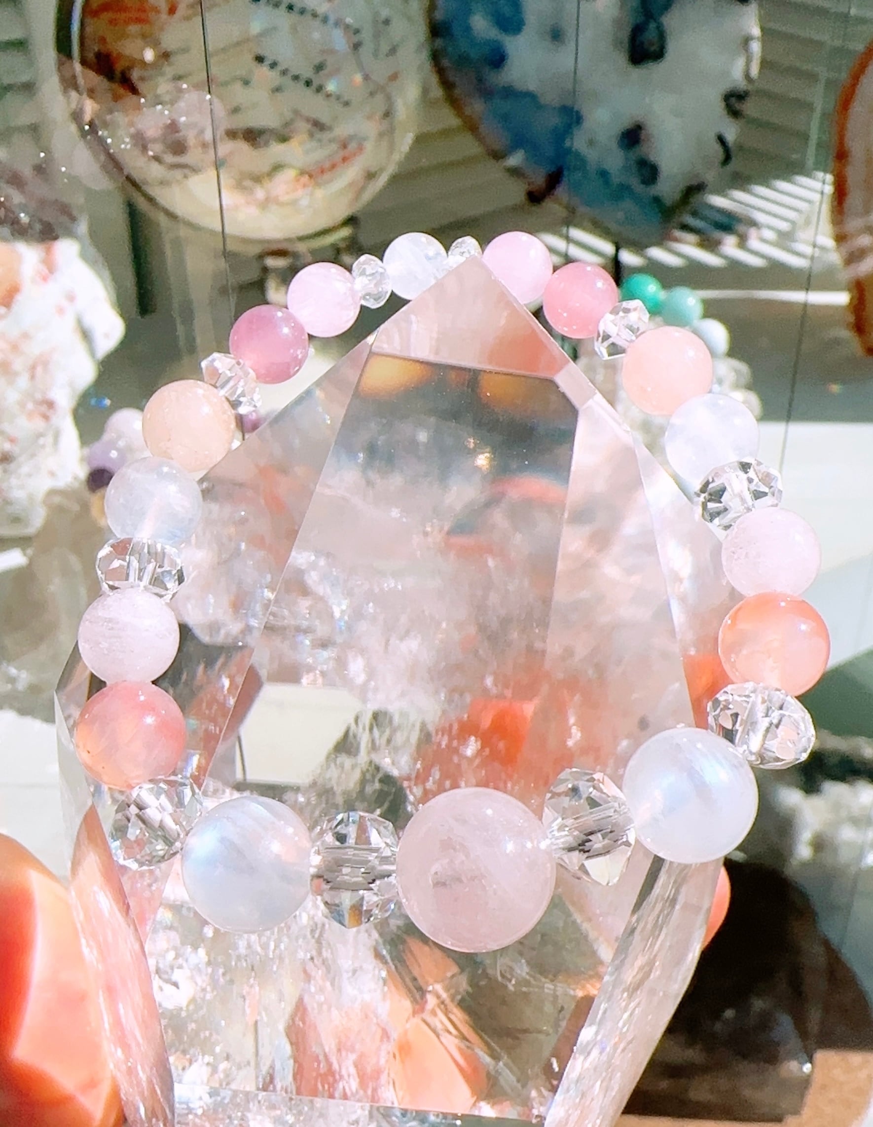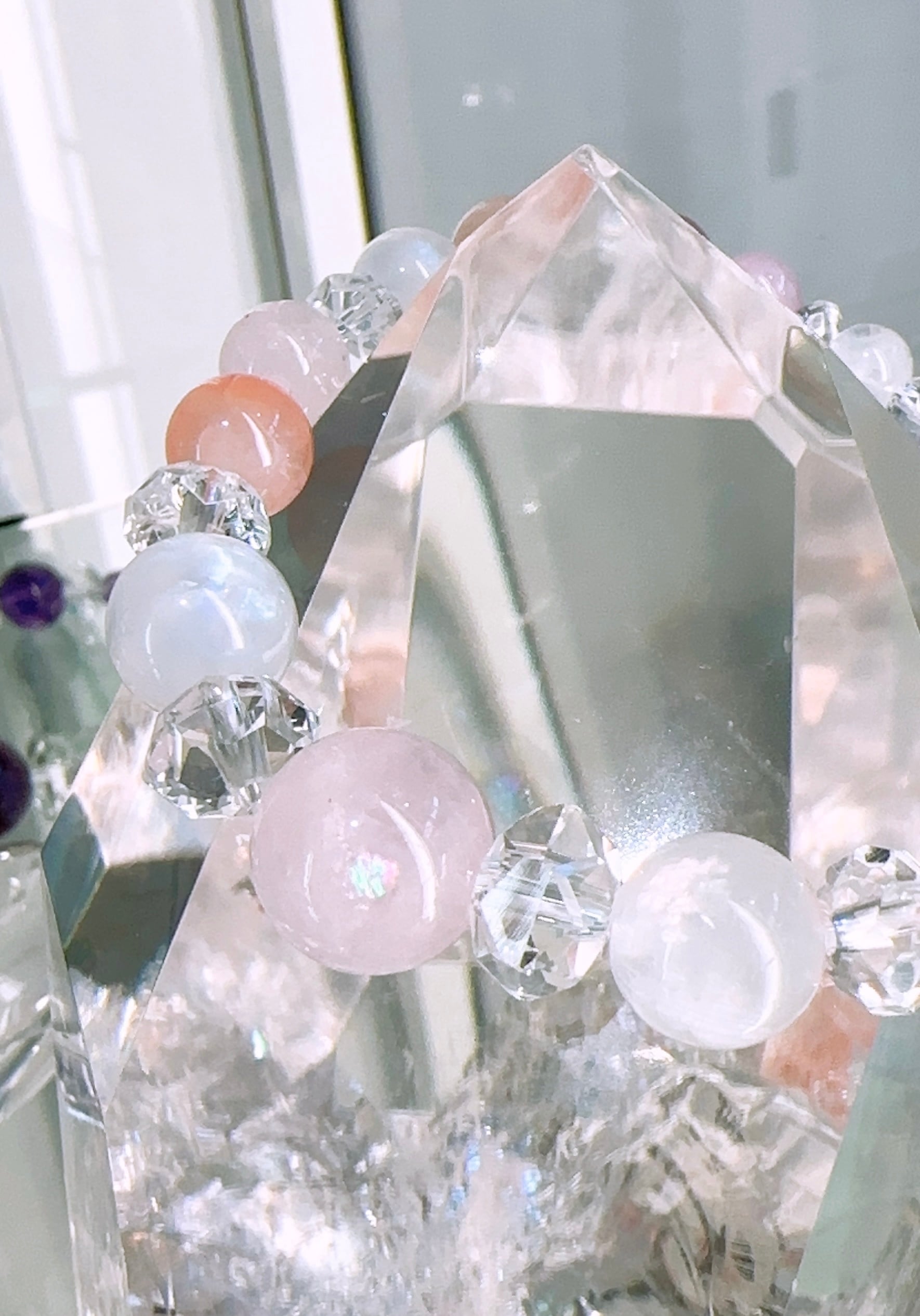 モルガナイト約12mm(1個),レインボームーンストーン約10mm(2個),ピンクボツワナアゲート約8.5mm(2個),モルガナイト約8mm(4個),レインボームーンストーン約8mm(2個),ディープローズクォーツ約7mm(2個),クンツァイト約6mm(2個),レインボームーンストーン約6mm(1個),スターカット水晶約7mm(2個),ボタンカット水晶約5mm(2個)ボタンカット水晶約4mm(2個),カット水晶約3.5㎜(2個),カット水晶約3mm(2個)