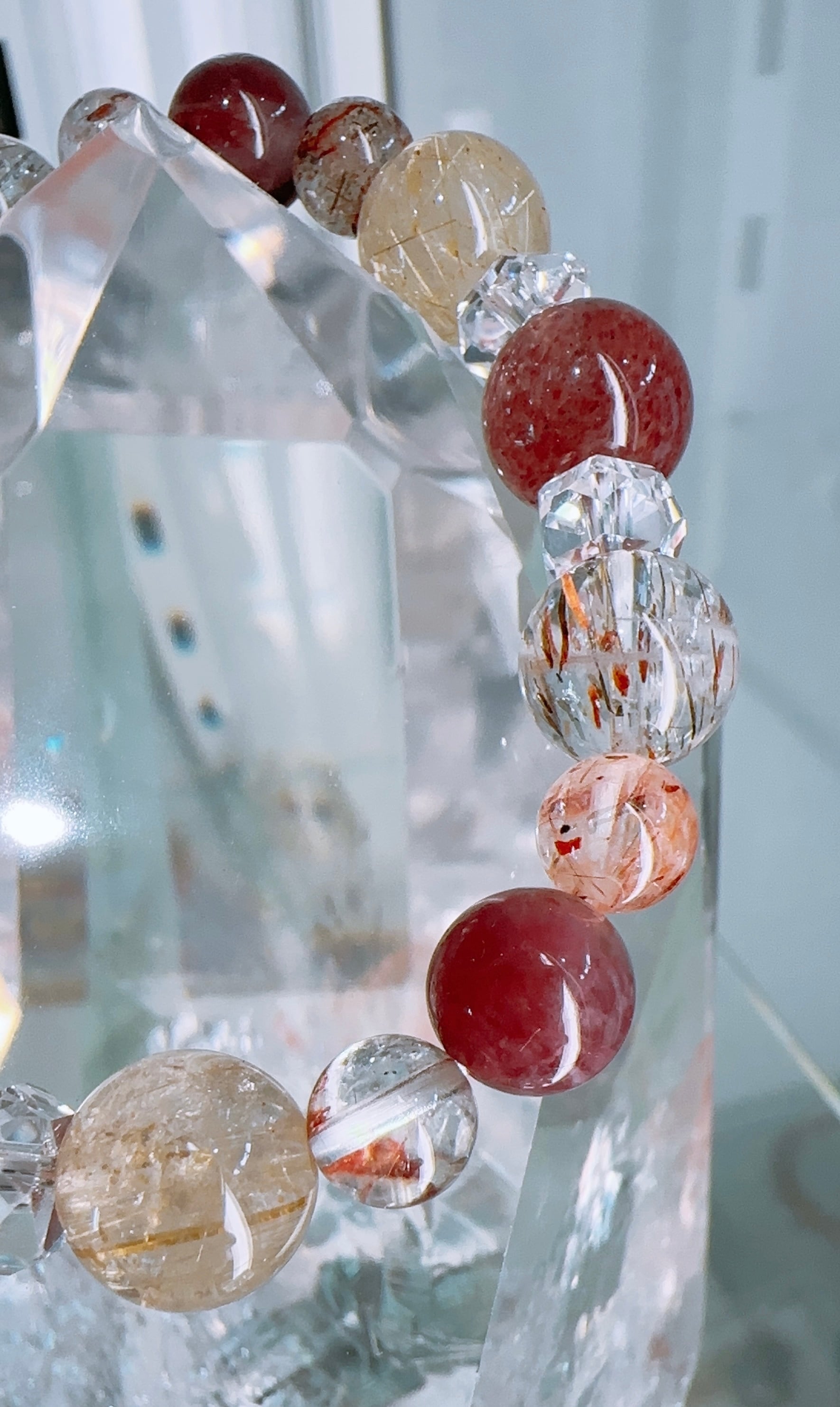 ポジティブエネルギーを放つトルマリン、心身を温め癒すストロベリークォーツ(ピンクエピドートinクォーツ)、邪気を祓うフォリエーテッドクォーツを使った、パワフルな開運と浄化のブレスレットを作成しました。