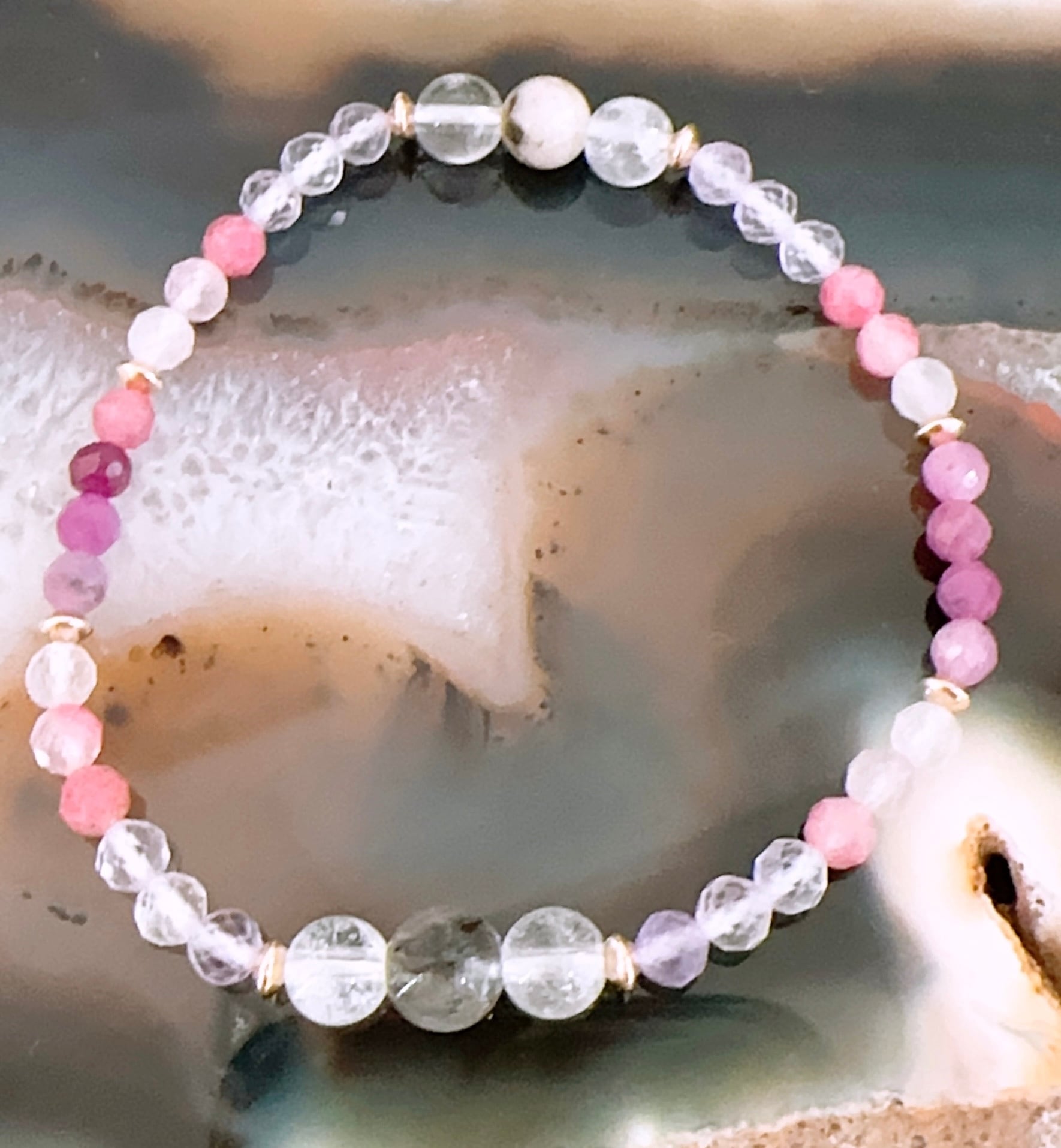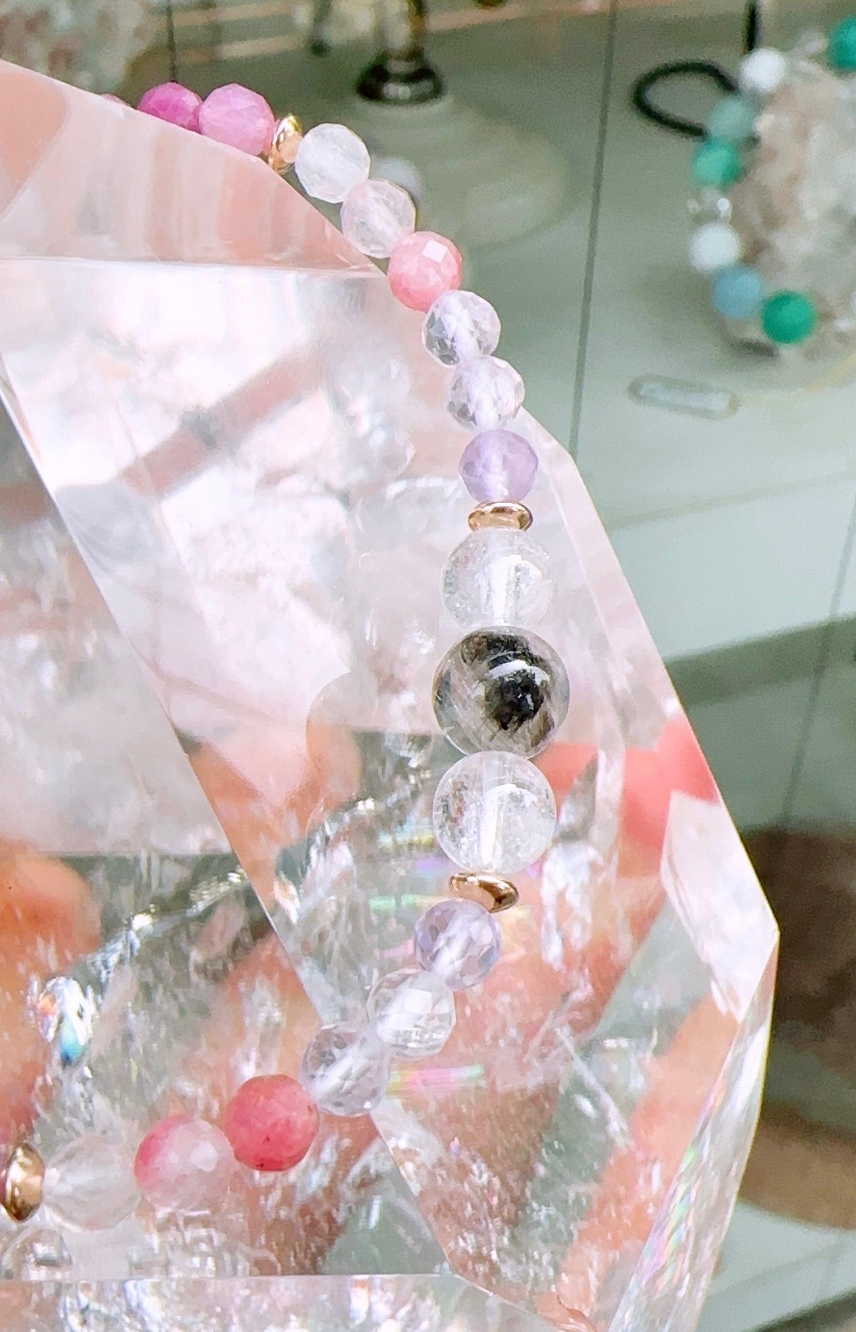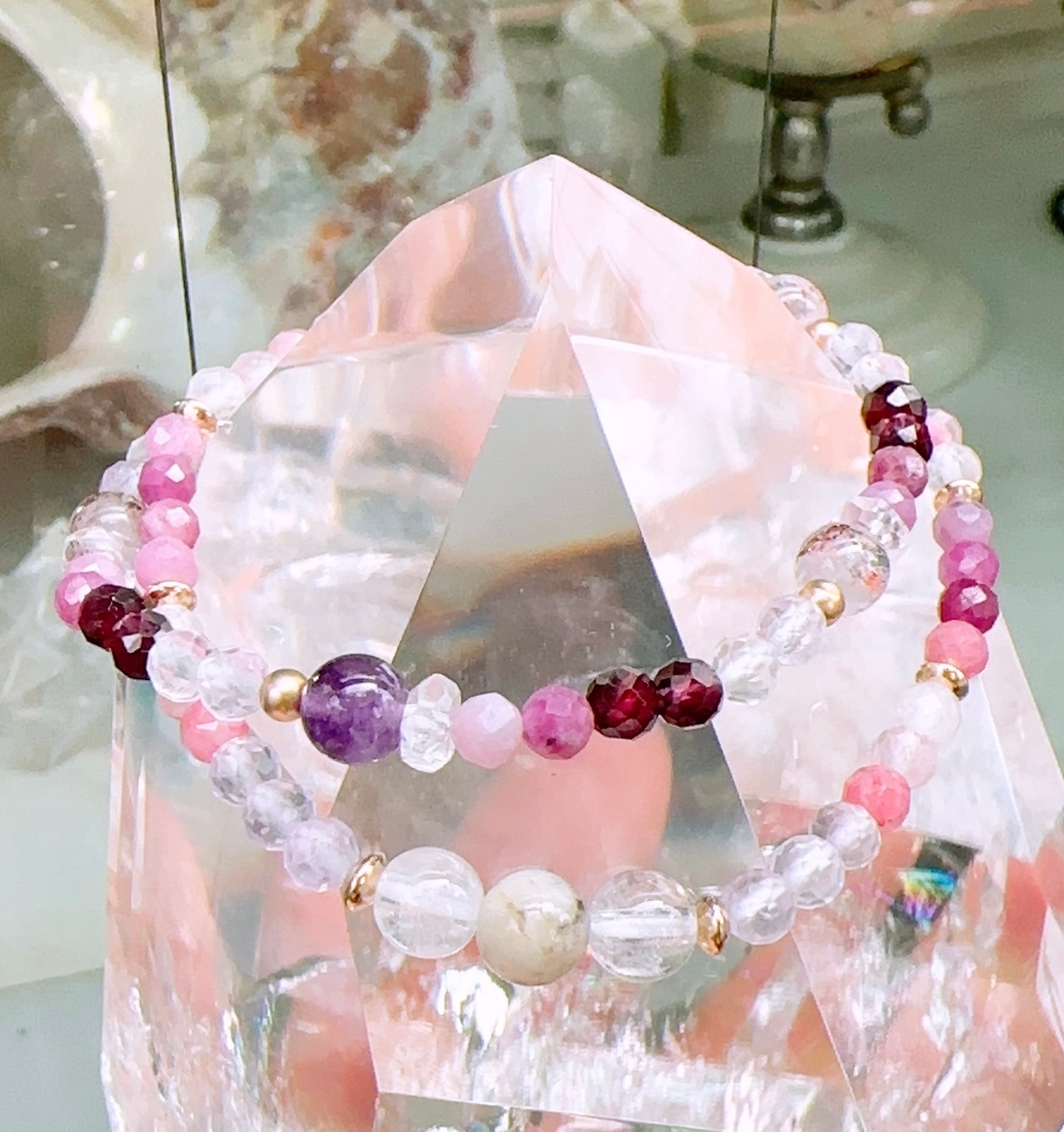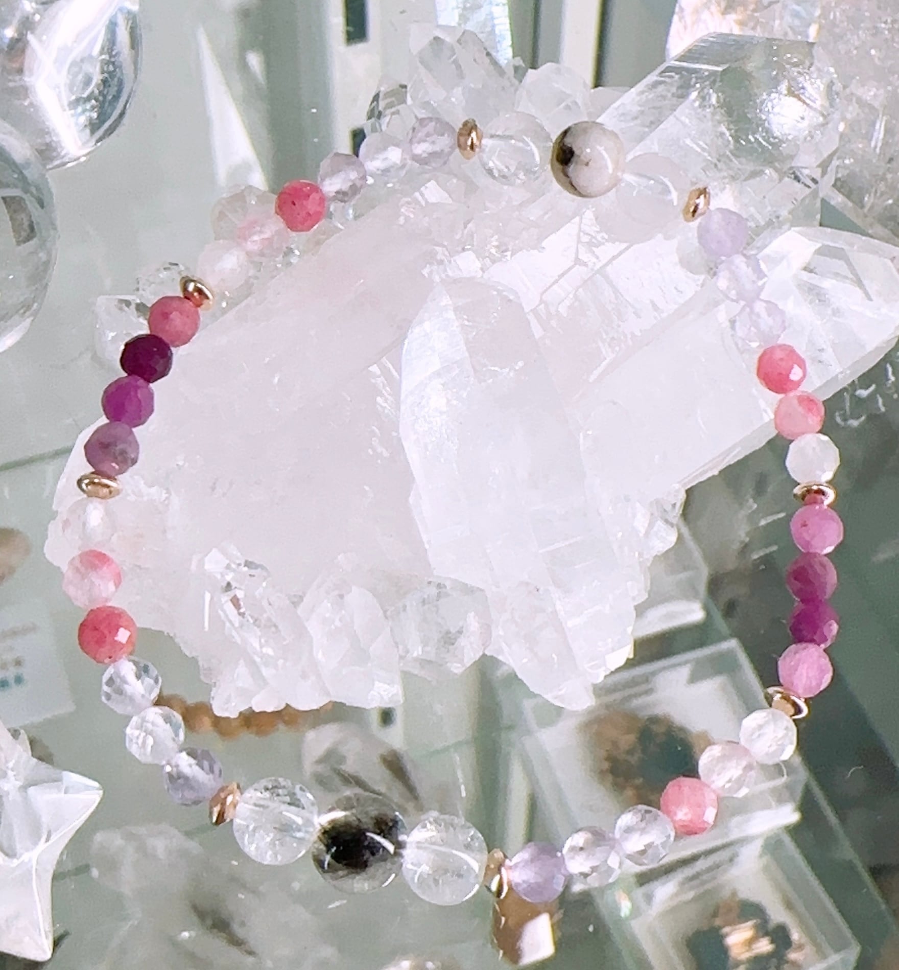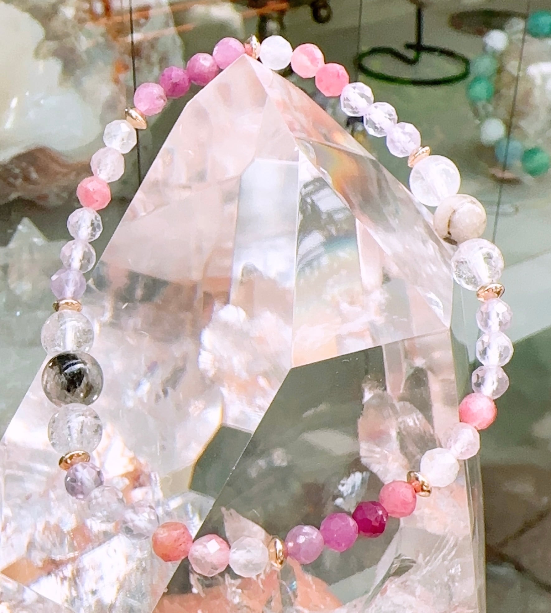 高波動の石たちをインド産のルビー(ピンクサファイア)、ロードナイトシリカ、ラベンダーアメジストと合わせて、女性性の直感力を高める、柔らかく美しいブレスレットに仕上げました。
