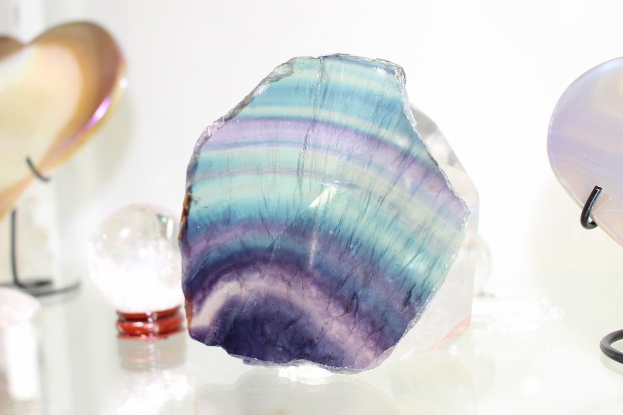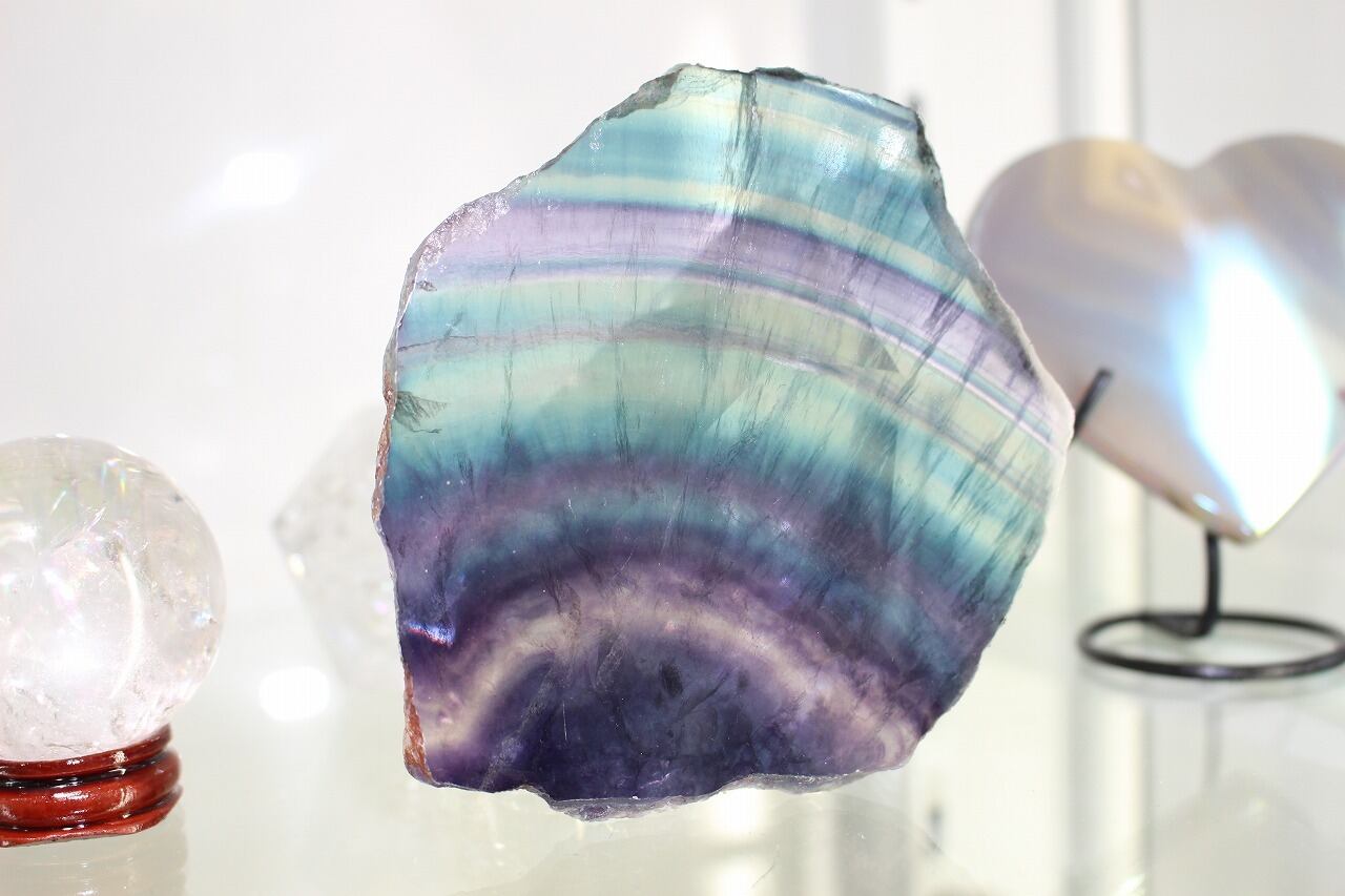 パープルとグリーンとブルーのグラデーションが美しいレインボーフローライトです。