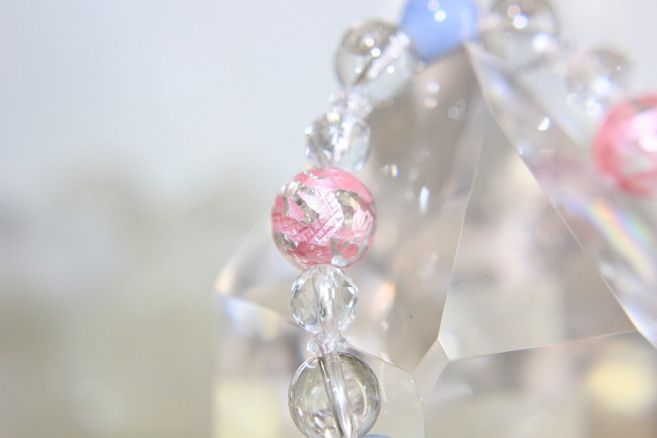 天然石サイズ 桃龍水晶約12mm(3個)、エンジェライト約10mm(3個)、水晶約10mm(6個) 、スターカット水晶約8mm(6個) 、ボタン水晶約2mm(6個)