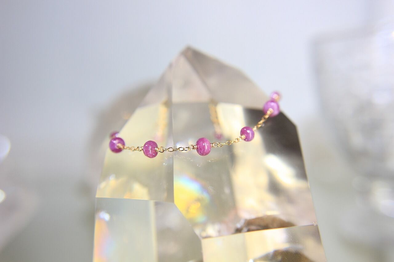 発色が綺麗なルビーを連ねて、繊細ながらも華やかなブレスレットにしました。