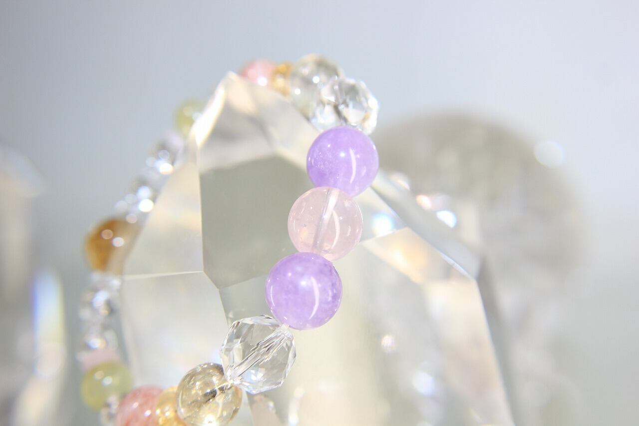 天然石サイズ スターローズクォーツ約12mm(1個) 、デンドリティッククォーツ約12mm(1個)、ラベンダーアメジスト約12mm(2個)、水晶スターカット約11mm(2個)、シトリン約10mm(2個)、サンストーン約10mm(2個) 、プレナイト約8mm(2個)、水晶約6mm(6個)、水晶ボタンカット約2.5mm(2個) 、水晶ボタンカット約2mm(2個)、ローズクォーツボタンカット約2.5mm(2個) 、シトリンボタンカット約3.5mm(2個)