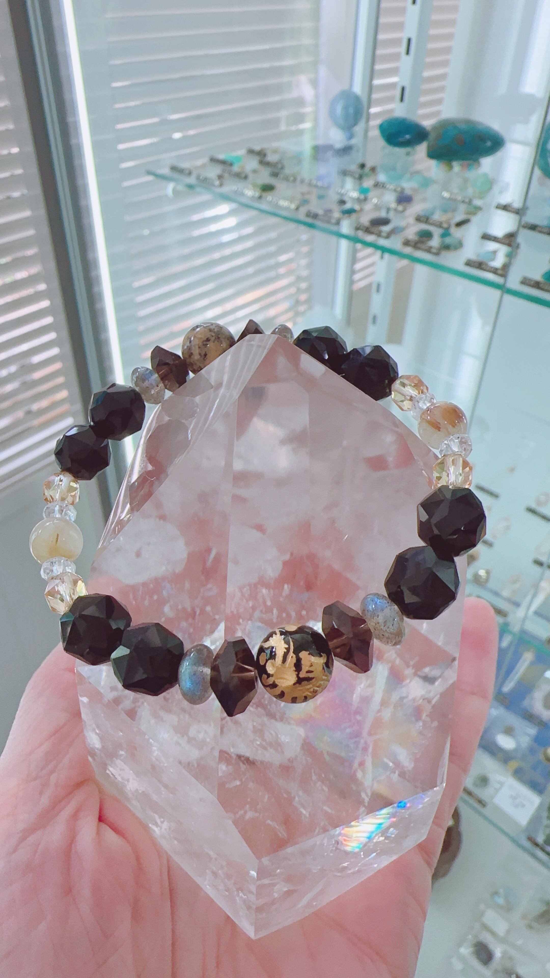 天然石サイズ 黒龍約10mm(1個)、鞍馬石約10mm(1個)、モリオンスターカット約10mm(8個) 、ゴールドルチルクォーツ約7.5mm(2個) 、スモーキークォーツボタンカット約5mm(4個)、ラブラドライトボタンカット約3mm(4個) 、スターカットシトリン約6mm(4個)、水晶ボタンカット約2mm(4個)