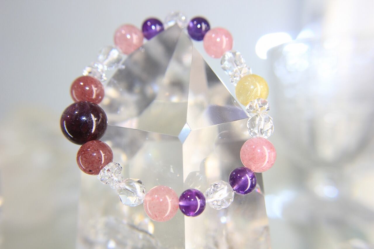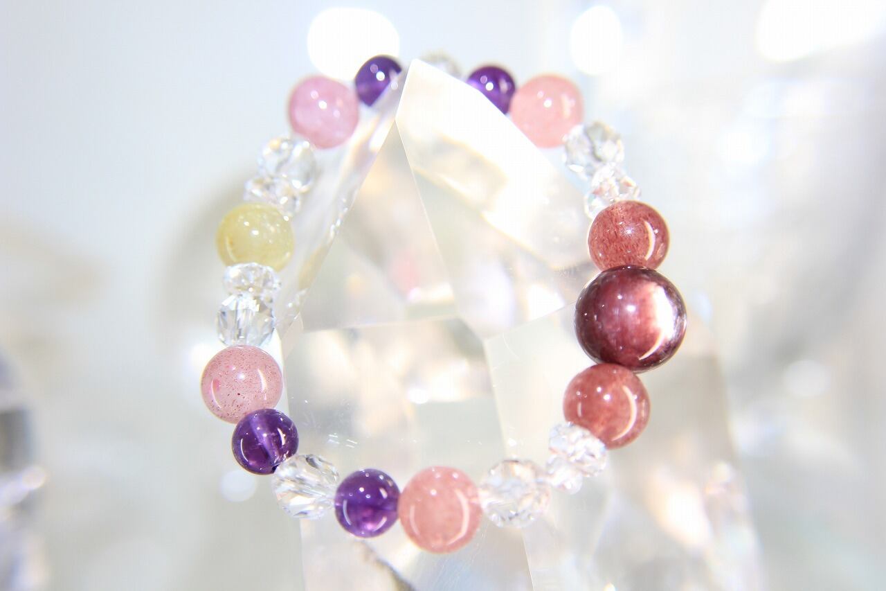 天然石サイズ スターレピドライト約13mm(1個)、ゴールドルチルクォーツ約10mm(1個)、ピンクエピドートインクォーツ濃約10mm(2個) 、ピンクエピドートインクォーツ約10mm(4個) 、アメジスト約8mm(4個)、水晶スターカット約8mm(6個)、水晶ボタンカット約3mm(4個) 、水晶ボタンカット約2mm(2個)