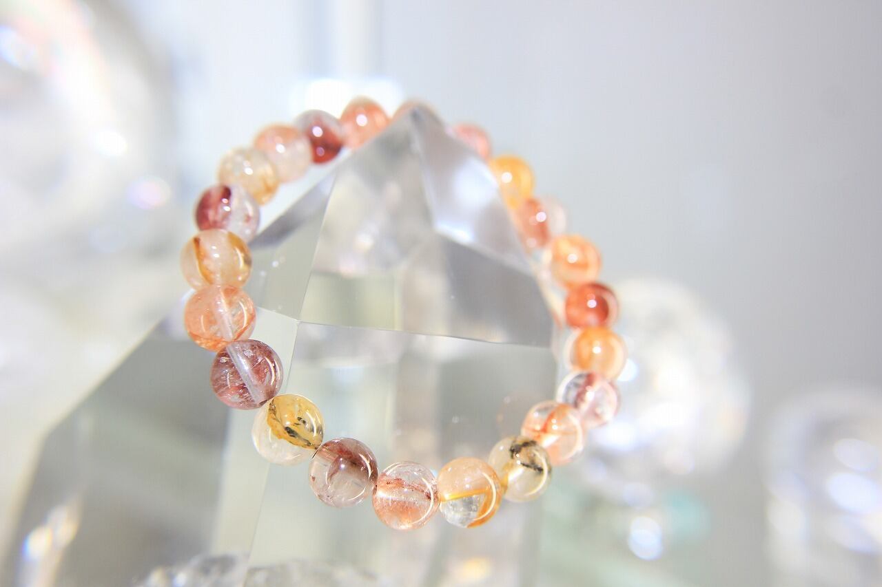 こちらは、日の丸のような赤、果実のようなオレンジ、デンドリティッククォーツの繁栄パワーのブレスレットです。