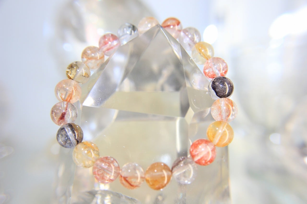 こちらは、黄色とオレンジと赤の発色が美しく、デンドリティッククォーツも入っていて、なおかつ、褐色のリモナイトが魔除け、邪気払いをしてくれるような、開運と守護のバランスの良いブレスレットです。