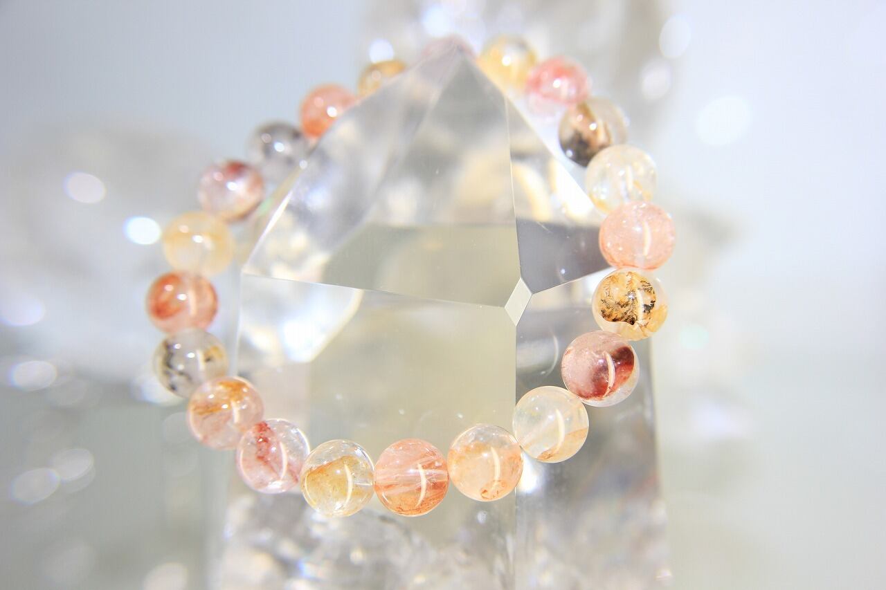 こちらは、デンドリティッククォーツの繁栄のエネルギーがダイレクトに伝わるブレスレットです。褐色の石が邪気を祓い、赤、黄色、オレンジのリモナイトインクォーツがポジティブな力を授けます。