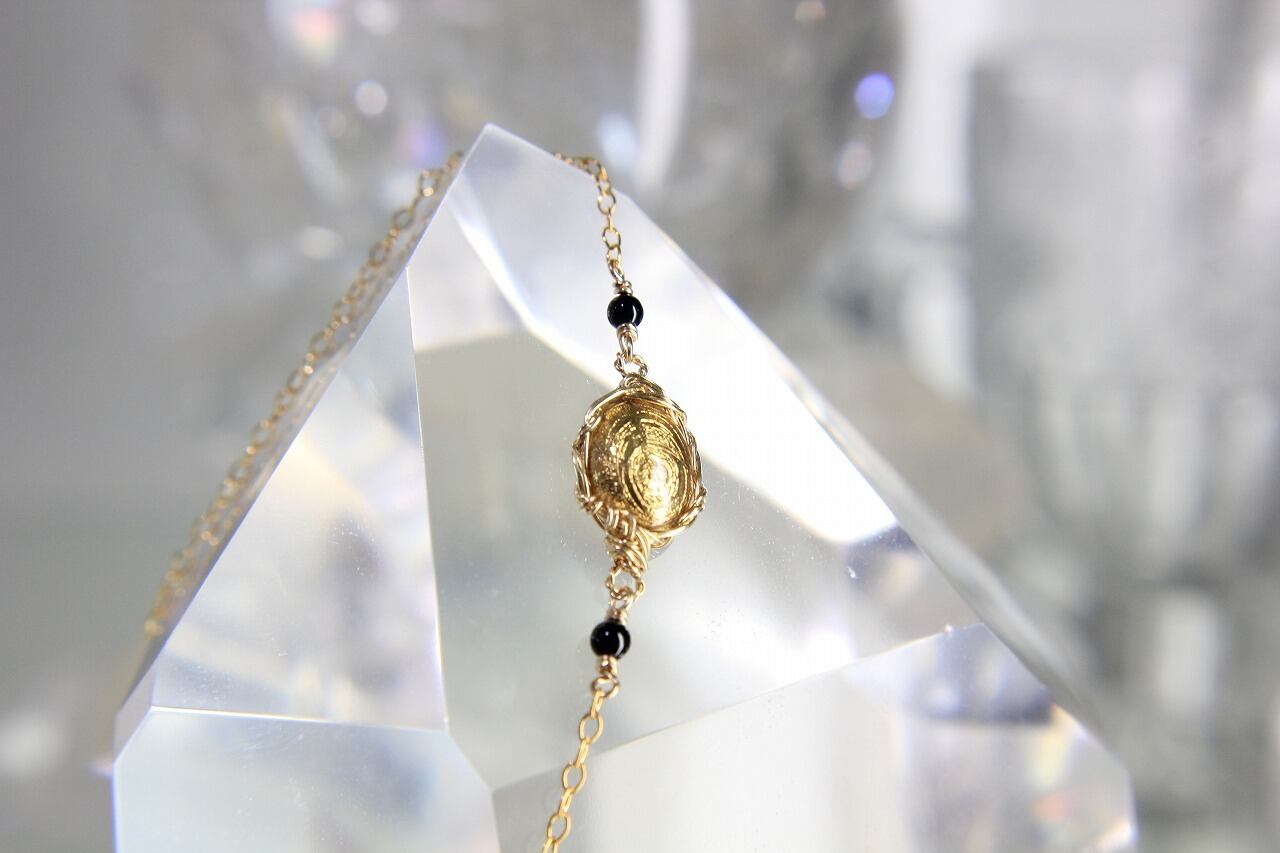 ワイヤーは14KGF(ゴールドフィルド)を使用しています。真鍮などの合金を芯として、14金によるコーティングが施されています。14金の層が、熱と圧力により圧着されていますから、見た目の輝きは金そのものです。