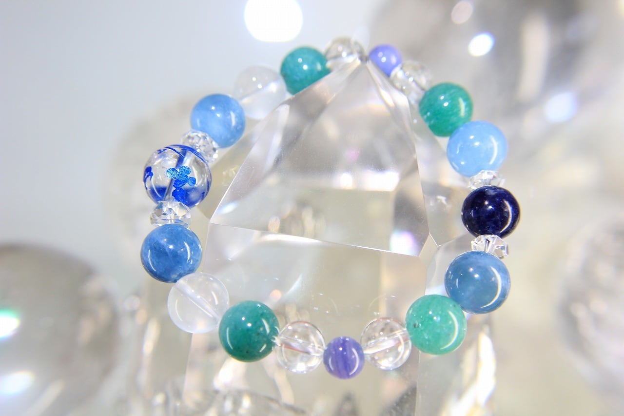 天然石サイズ 青龍水晶約12mm(1個) 、アクアマリン約10mm(4個)、ソーダライト約10mm(1個) 、アベンチュリン約10mm(4個)、ミルキークォーツ約10mm(2個)、タンザナイト約7mm(2個)、水晶8mm(4個)、水晶ボタンカット約3mm(2個)、水晶スターボタンカット約3mm(2個)