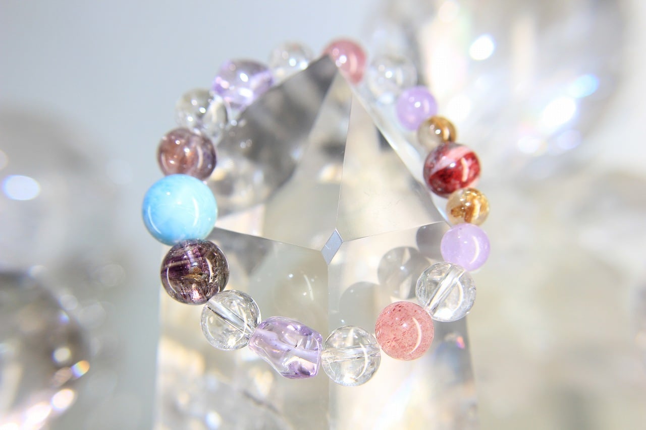 ラリマー13mm(1個) 、シナバークォーツ10.5mm(1個)、ピンクエピドートインクォーツ10mm(2個) 、スーパーセブン11mm(2個)、クリアアメジスト11mm(2個) 、カンチェンジュンガ水晶10mm(6個)、ラベンダーアメジスト8mm(2個) 、ゴールドルチルクォーツ7.5mm(2個)、mm(個)