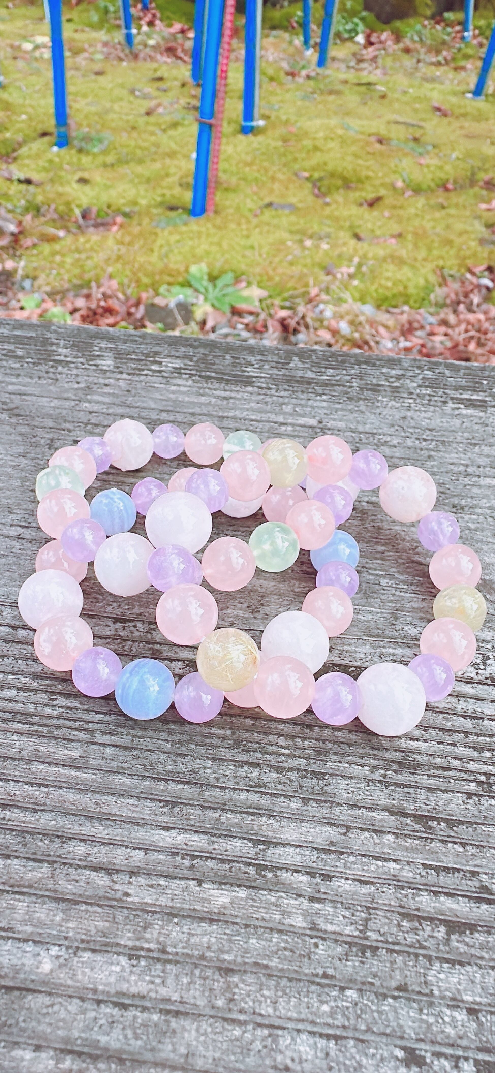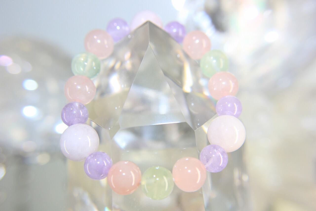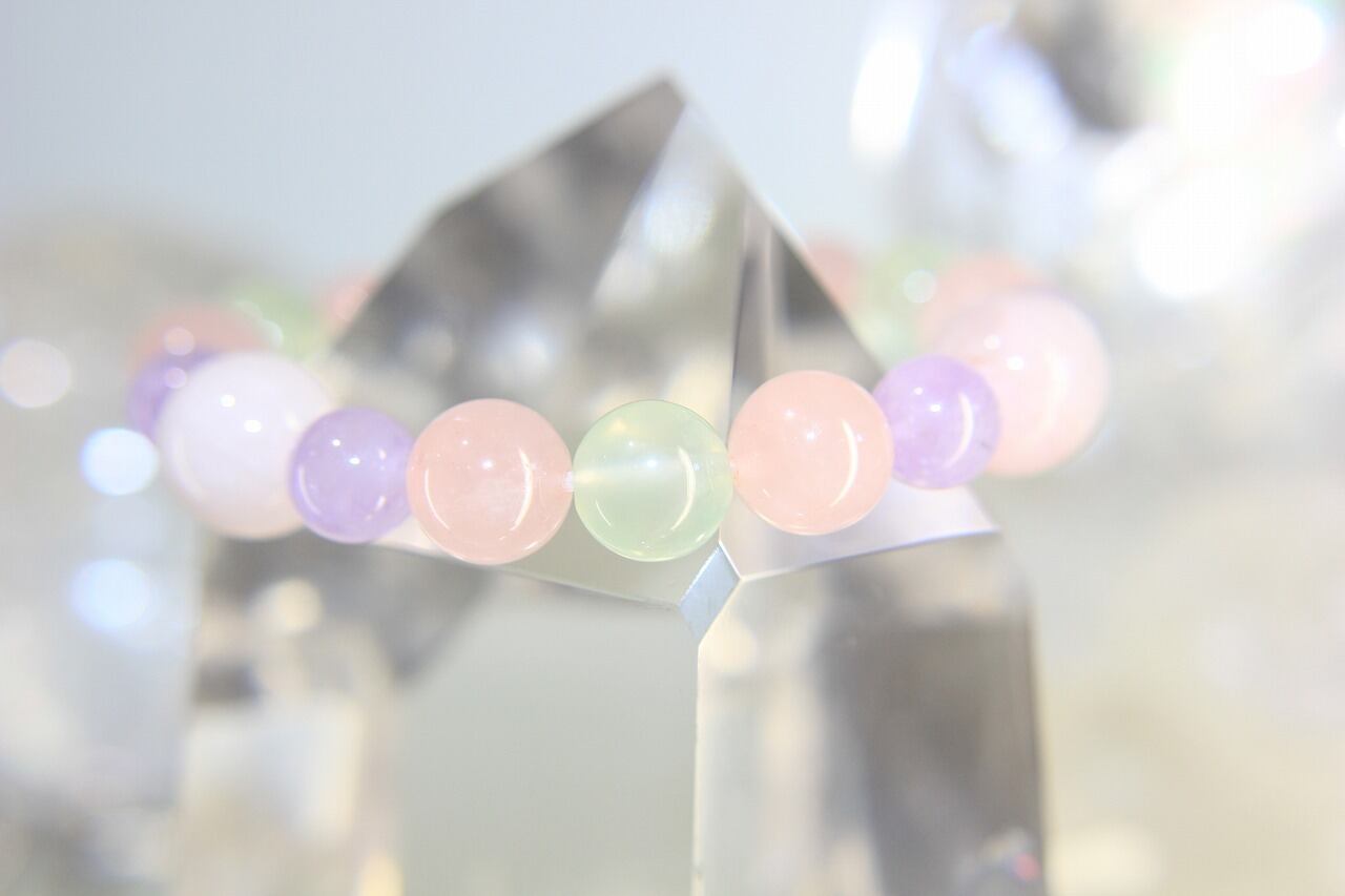プレナイト10mm(3個) 、モルガナイト12mm(3個)、ローズクォーツ10mm(6個) 、ラベンダーアメジスト8mm(6個)